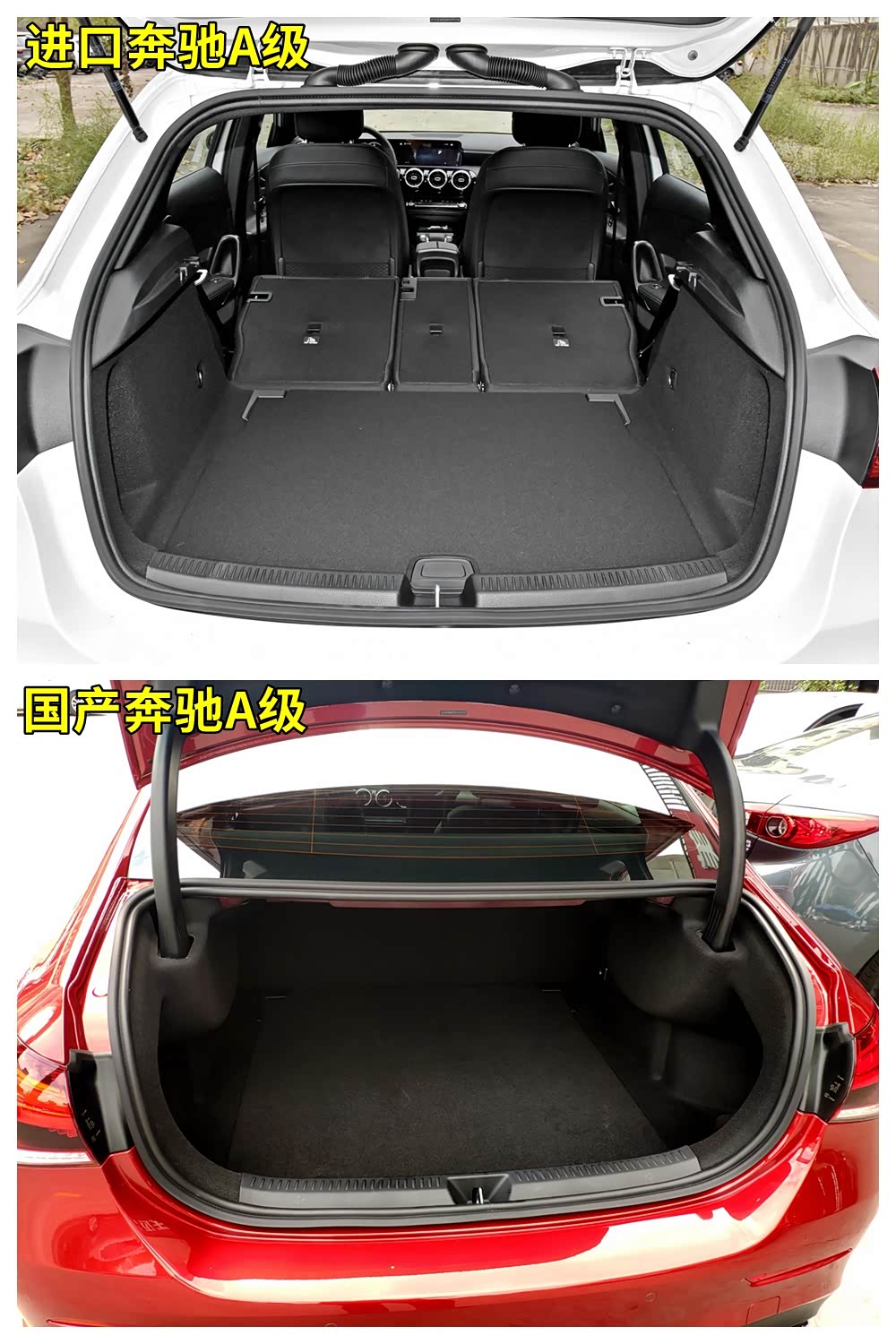 进口两厢A级的后排座椅可以放倒,这样后备箱和后排座椅空间是连在一起的,可以放下平板电视、自行车等大件物品,临时搬个家也不成问题。而国产的三厢A级即使放倒后排座椅,由于后备箱开口就那么大,一旦超过尺寸的东西就放不进去了,对于物品的高度有要求。