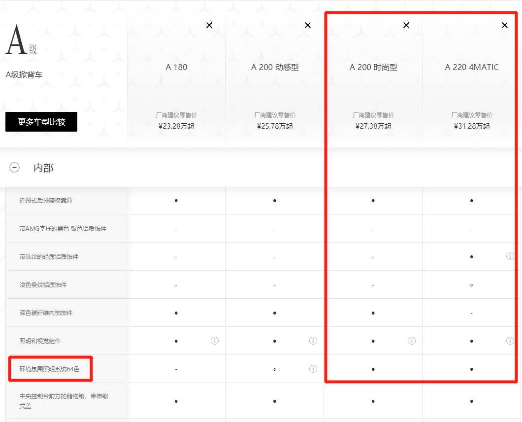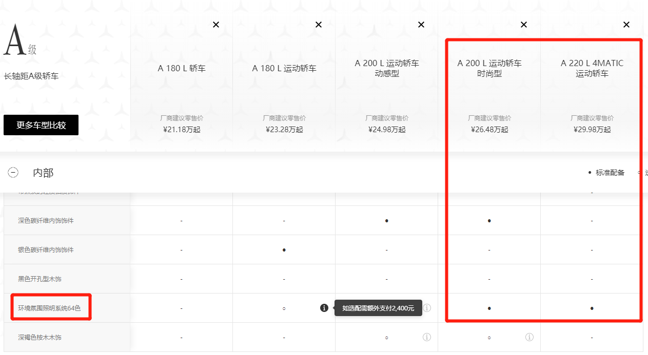 上面提到的非常漂亮的氛围灯,也不是全系车型标配,最低配的A180也是没有的,也不能选装。只有到了最低配往上一个级别才能选装,选装费用也不高,2400元。各位如果给老婆买车,这个氛围灯一定要选装。或者直接买标配氛围灯A200。