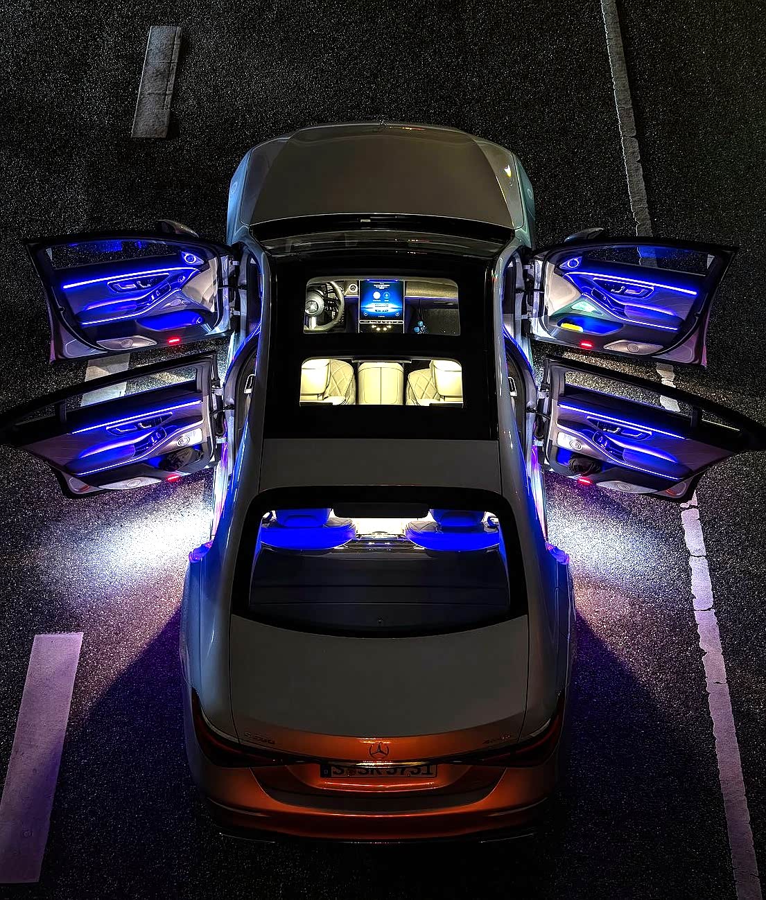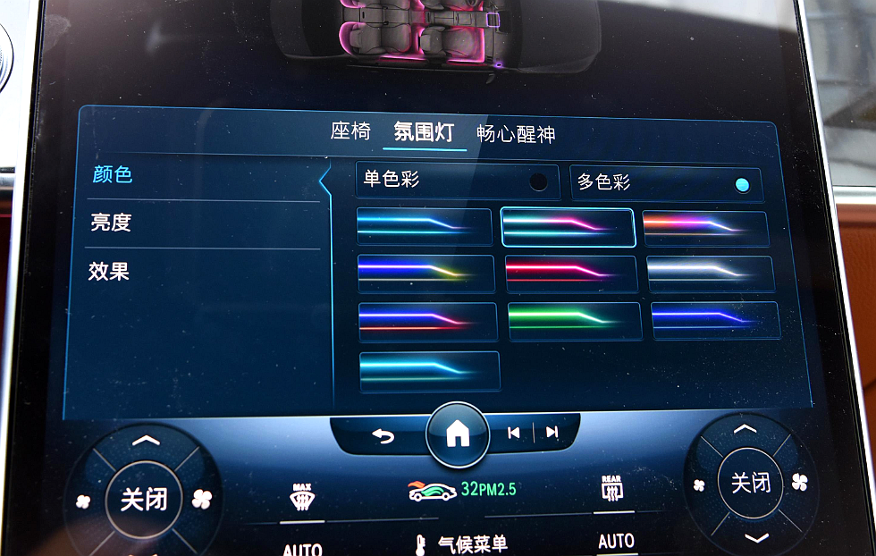 而到了现在,奔驰的氛围灯不光颜色种类更多了,而且还有多彩的渐变色可以选择。前阵子刚刚上市的奔驰最新款S级,它的内饰氛围灯由263个可多色渐变的LED光源组成,不光有单色,还有多彩色,晚上的视觉效果非常漂亮。