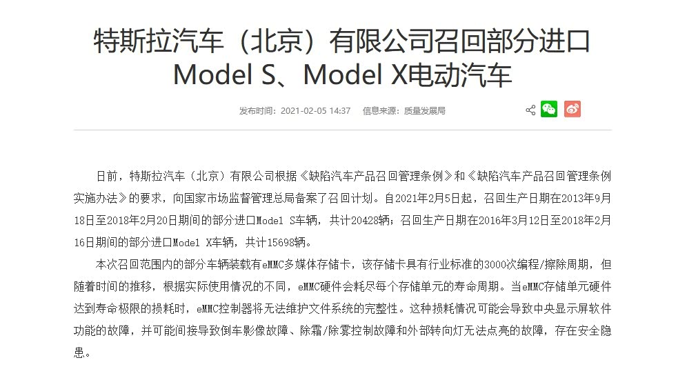 具体而言,此次召回的车型上所装载的eMMC多媒体存储卡,在达到寿命极限的损耗时,将无法维护文件系统的安全性,从而导致中央显示屏软件功能的故障,可能产生倒车影像故障、除霜/除雾控制故障、外部转向灯无法点亮等故障,导致用车安全隐患。