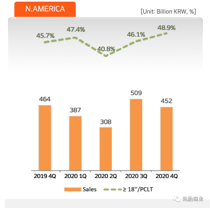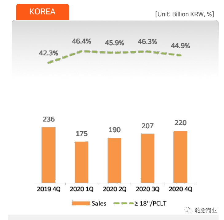 面对2021年,韩泰轮胎信心满满,预计销售额将达到70000亿韩元(约合人民币405亿元),同比增长大约10%。18寸及以上轮胎销量将持续保持增长,销售占比将达到38%(2019年为32%,2020年为35%)。