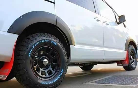 除了边角处较为圆润外,整个侧面的设计都十分的方正,看起来像是大“面包车”的视觉感,整个车身没有腰线的设计,只在车门下方有着一条凹陷的平直线条,而两侧外突的熏黑饰板镶嵌轮毂设计,搭配镂空的熏黑轮毂,让新车运动感直接加满。