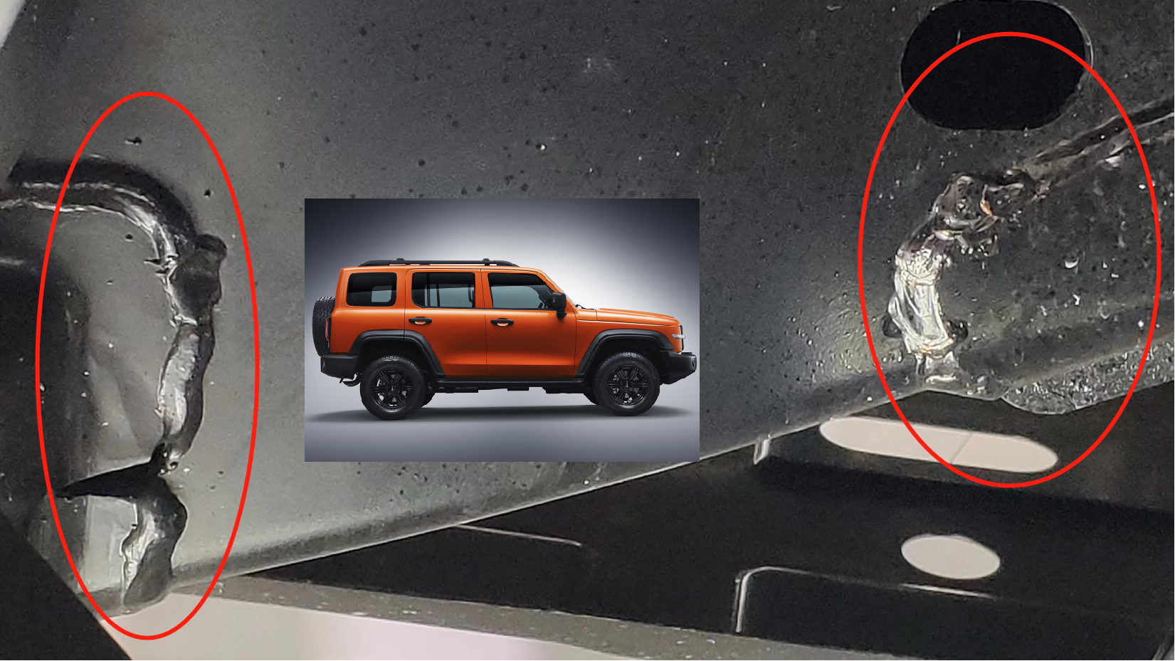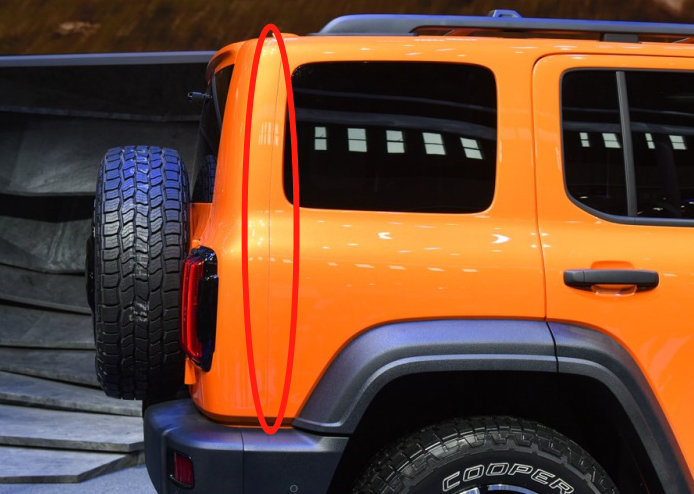 并没有采用整体冲压。对于定位“硬派越野”的车型而言,车身抗扭性非常重要,但是在坦克300的C柱之后,我们能够看到明显的焊接痕迹,坦克300的大部分车身还是一次冲压,但是尾门框的两侧则是单独冲压然后进行焊接。目前来看并没有问题,但是如果有车主长期进行高强度越野活动,这样的设计或许会导致车身挤压变形。