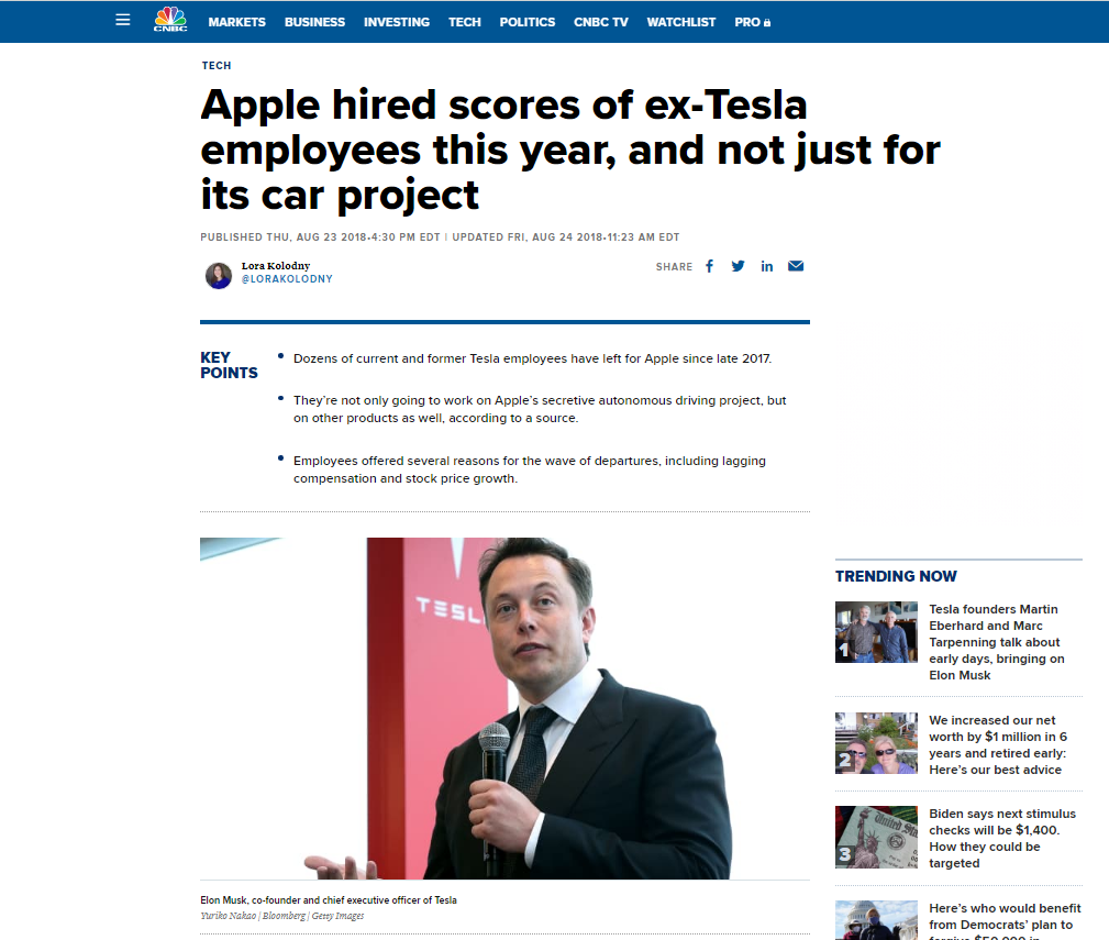 苹果从特斯拉“挖”走了许多工程师及高管,包括之前提到的道格·菲尔德,还有首席汽车设计师安德鲁金、副总裁迈克尔·施韦库奇等,涉及了车身设计、动力系统、车辆研发、质量工程等多个领域。