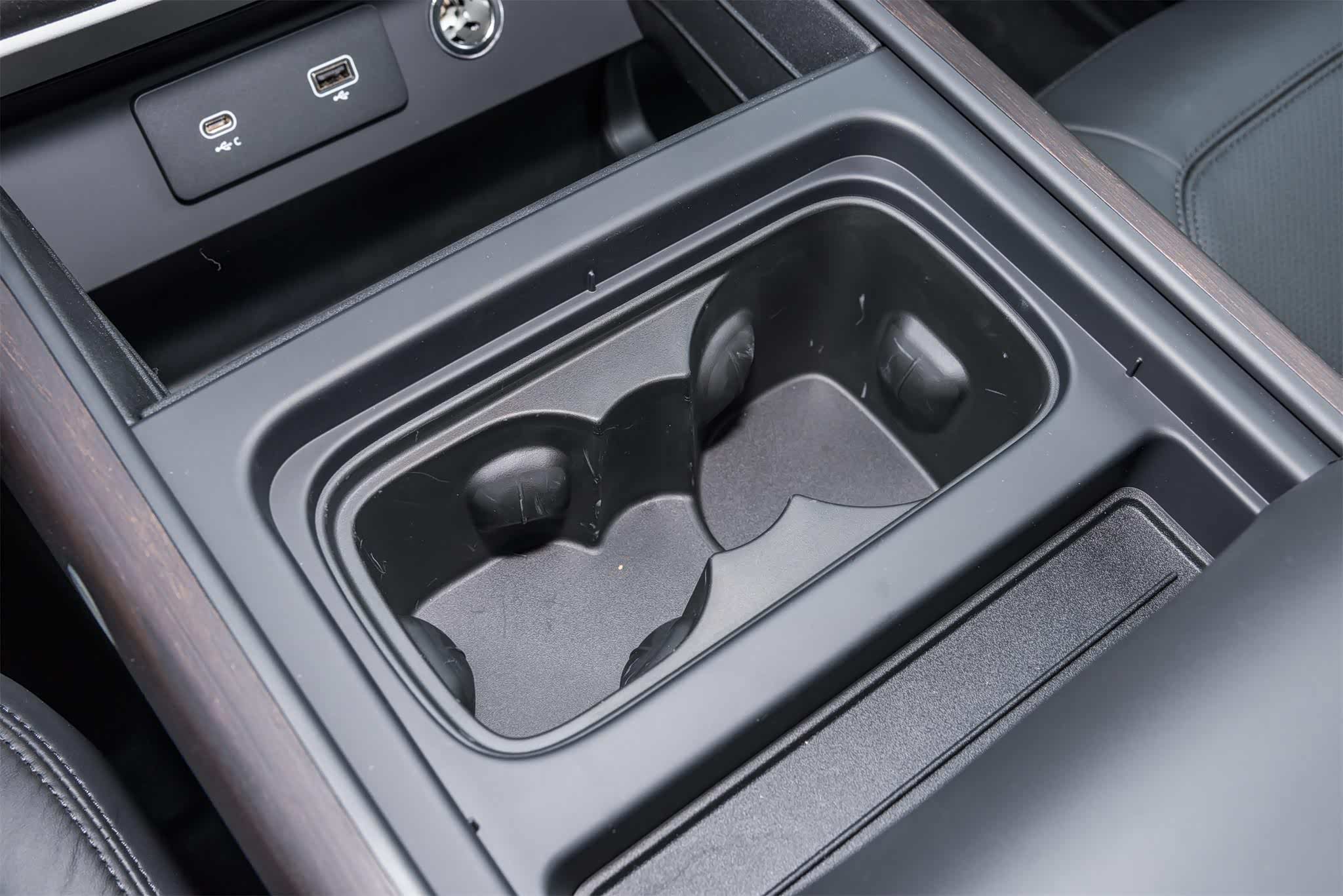 宽大的中央扶手箱内设置了杯槽和无线充电区域,横向排列的杯槽取用水杯比较方便,但是杯槽深度较浅,在一定程度上影响了使用体验。