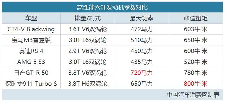CT4-V Blackwing定位为B级性能车,该车换装了一台3.6T V6双涡轮增压发动机,经过工程师的重新调校后,其最大功率达到了472马力,峰值扭矩603牛·米。我们可以拿来跟宝马M3、奥迪RS 4或者AMG 53系列做个对比,通用的这台3.6T V6虽然排量优势明显,但似乎升功率的数据并不算突出,起码升功率远不如宝马的S58六缸引擎(雷霆版),更别说V6中的王者——日产GT-R(排量相近)。