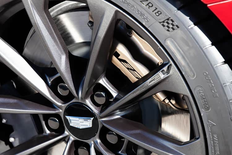 轮毂部分,两车均采用高强度铝合金锻造轮毂,CT4-V Blackwing是18英寸,而CT5-V Blackwing是19英寸。刹车采用是Brembo制动钳,前面是六活塞后面是四活塞,这也是该类型车辆的标准配置。如果你追求极限刹车力度和簧下质量,还可以选装更轻量化的碳陶材质刹车系统。