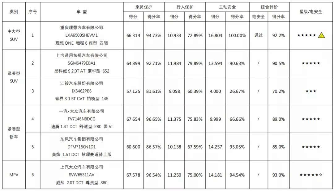 2月8日,中汽研C-NCAP发布了2021年度第一批车型碰撞测试评价成绩,参与碰撞试验的车型共有6款,参与测试车型包括 理想ONE、别克昂科威S、大众速腾、东风奕炫、上汽大众威然、福特领界S。