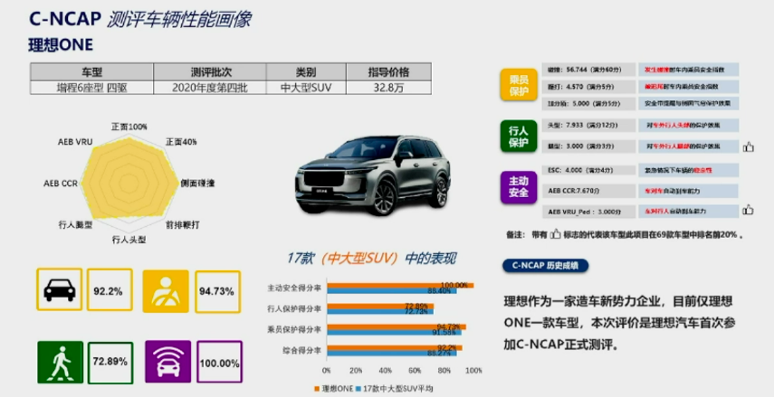 作为唯一一款新势力车企,理想ONE在此次碰撞评测中获得了较高的评分,其中乘员保护得分率94.73%、行人保护得分率72.89%、主动安全得分率高达100%,也是这次测评的6款车型中唯一获得100%得分率的车型。