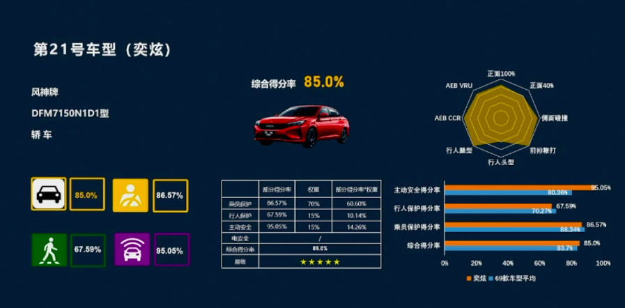作为自主品牌的东风奕炫在此次评级中获得综合评分倒数第二的成绩,但依旧获得五星评级。它的乘员保护得分率86.57%、行人保护得分率67.59%,主动安全得分率高表现出色,达到了95.05%,在这次的6款测评车型中仅次于理想ONE,最终综合评价得分率为85.0%。