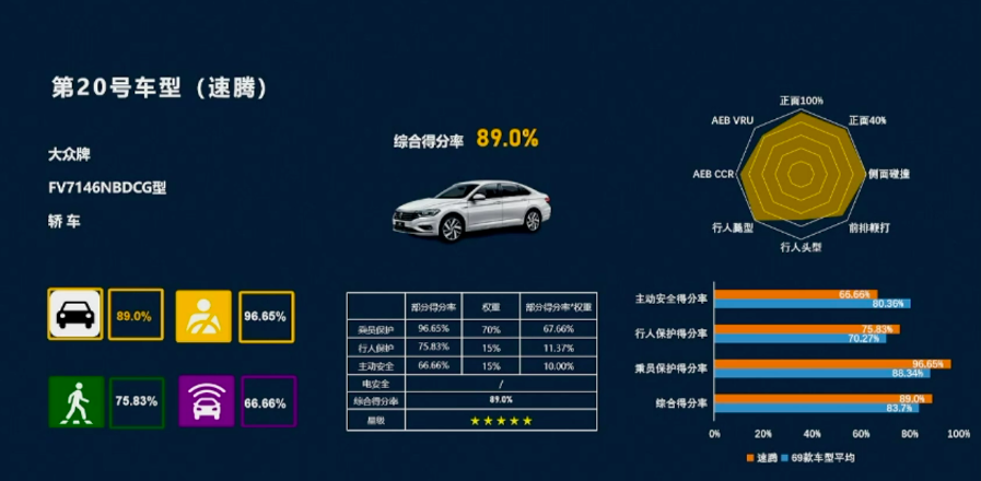 对于大众速腾这款车大家应该非常熟悉了,紧凑级轿车,在这次测评中,它乘员保护得分率96.65%、行人保护得分率75.83%、主动安全得分率66.66%,最终综合评价得分率达到了89.0%。