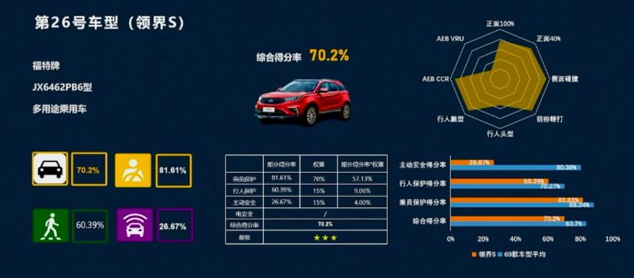 江铃福特领界S的表现有些不尽人意,其中乘员保护得分率81.61%、行人保护得分率60.39%、主动安全得分率仅有26.67%,这几项成绩均是垫底的水平,最终综合评价得分率为70.2%,仅获得3星无疑让人失望。毕竟一向给予车企五星评级的中汽研C-NCAP与中保研有着很大差距,若在中汽研C-NCAP都获得不佳的成绩,可想而知该车型安全方面的防护让人担忧。