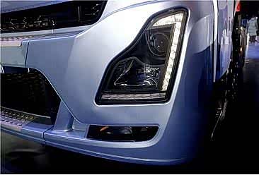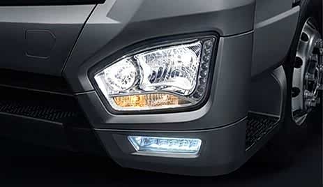 福田欧曼EST-A的远、近光灯和转向灯集成在一起,日间行车灯和前雾灯采用LED光源,冷色调光线带来更强的科技感,让车灯看上去像是一个“变形金刚”的眼睛。