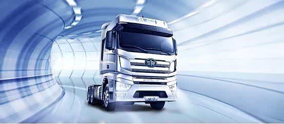 一汽解放自主研发的第七代车型——解放J7牵引车的车灯采用四边形设计,L形LED日间行车灯包围着远、近光灯,LED转向灯横陈于底部。下方的示廓灯和雾灯采用一体式设计,使整体造型尽显高端,更具力量感。