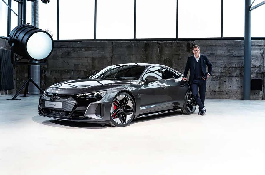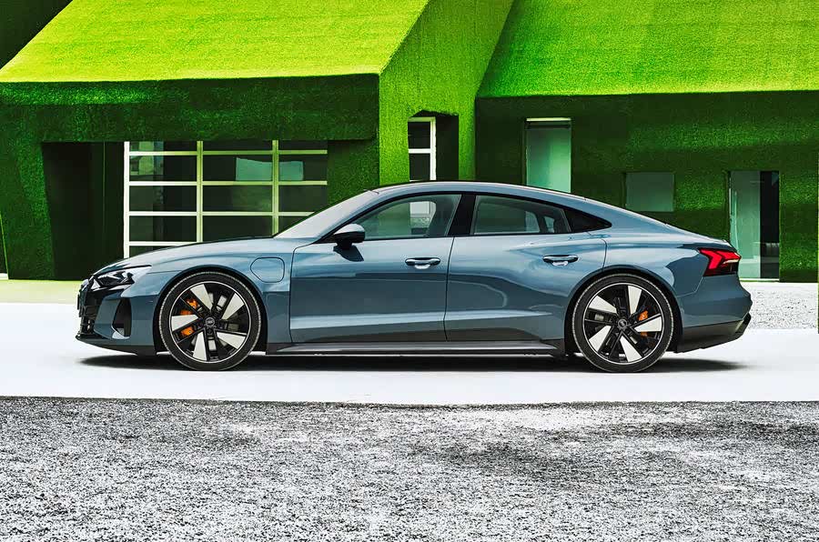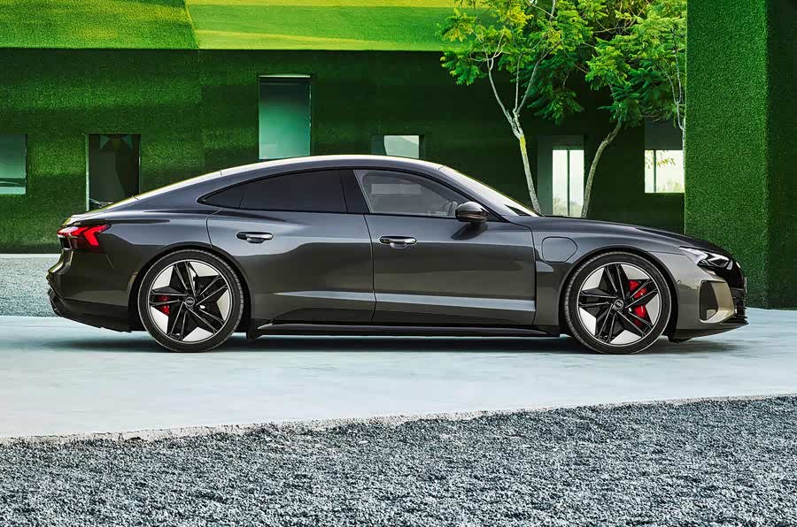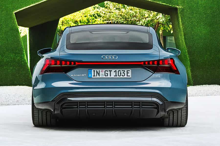 奥迪试图尽可能地保留2018年E-tron GT概念车的设计。所以量产车与概念车的姿态和比例几乎完全相同,车顶线条倾斜度大,肩线宽阔,引擎盖低矮,并有非常明显的宽体。E-tron GT长4.99米,宽1.96米,高1.41米,比与之共享架构的保时捷Taycan长3mm、高3mm,宽度几乎相同。车顶比A7 Sportback的低了17mm,这是设计师们确保其外观更具运动感的一个重要目标。与Taycan一样,电池布局方面特意预留了两个“脚坑”,提升后排乘客的乘坐空间。