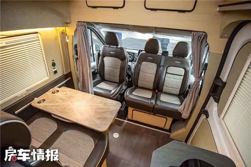 驾驶室的整个设计沉稳大气,驾驶室座椅的包裹性很好,座椅采用1+2的组合方式,搭配超纤皮+织物制作,舒适程度高,驾驶室座椅都可向后旋转,与后排组成对卡座的形式。一定程度上使得会客空间更加的灵活。