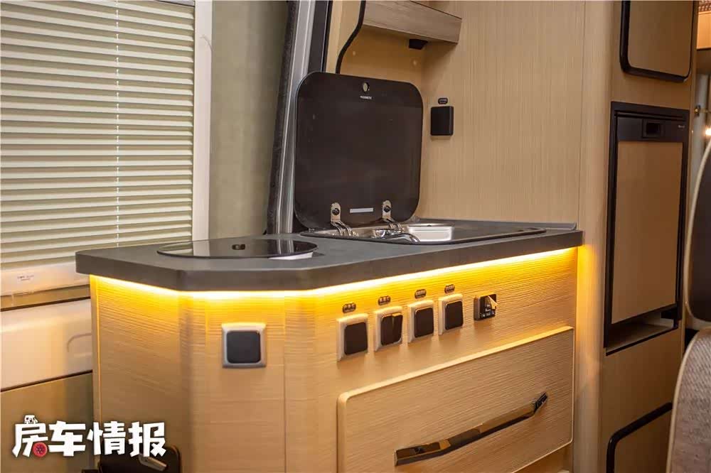 厨房区域配备了齐全的餐厨设备,操作台上布置有电磁炉、带盖水槽,后方还有50L房车专用冰箱以及提供了赛特福德90L冰箱和微波炉的选装,可以满足客户选择。卫生间区域空间并不是很大,但是配有洗手池、马桶、淋浴装置等基础设施,满足日常生活使用。