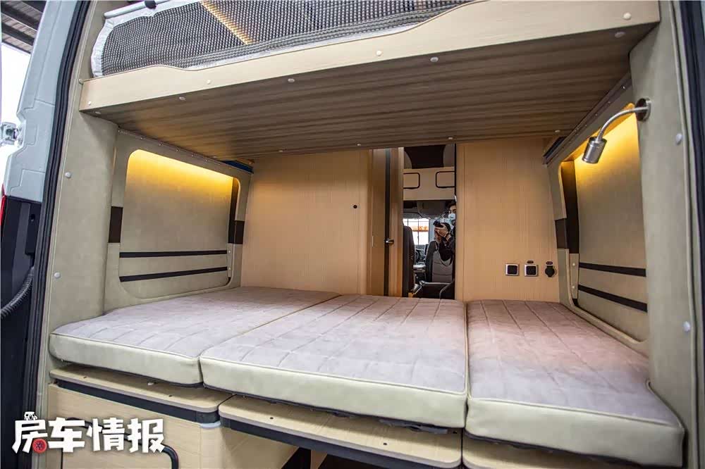 该车的休息区域位于床尾部,两张上下床的组合完美利用了V90底盘的优势,可抽拉上铺尺寸为:1820*1250mm,三段折叠下铺尺寸为:1950*1300mm,不使用时还可以收起,解放更大的空间,同时也解决了旧款V80车型后横床仅长1800mm的痛点。