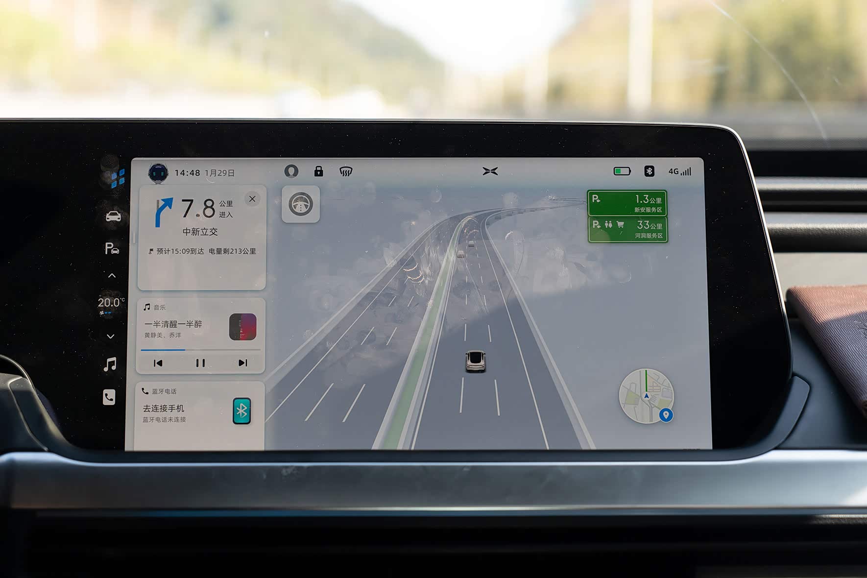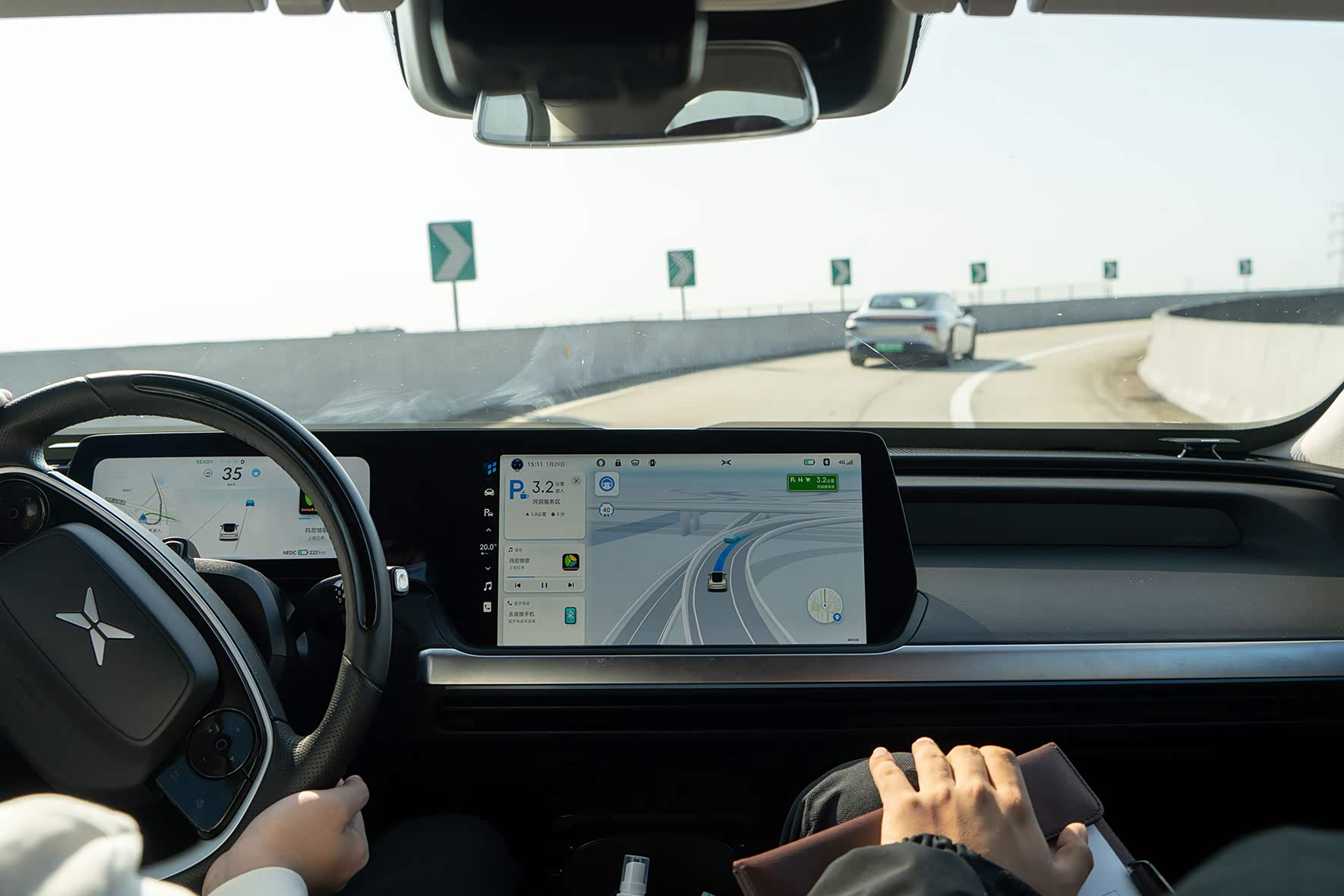 此次 NGP 体验路线为高速路段,总计 90km,有京港澳高速、广河高速等路段,在使用前需设置好目的地的导航,开启 NGP 功能,进入 NGP 可用路段(屏幕地图左侧显示灰色方向盘则为 NGP 可开启,只需要向下拨动两次档杆就行了)