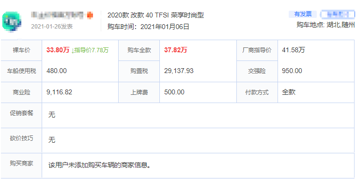 接下来聊聊目前这辆车的优惠情况到底如何。对于低功率Q5L车型来说,走量的还是指导价41.58万的2020款 改款 40 TFSI 荣享时尚型。这个是湖北随州的一位朋友,他是21年1月6号买的Q5L,优惠了7.78万(差不多优惠了19个点),优惠完之后的裸车价33.8万,购置税3万左右,保险预估1万左右,上牌费500元,在不含其它任何杂费的情况下总价落地37.8万。