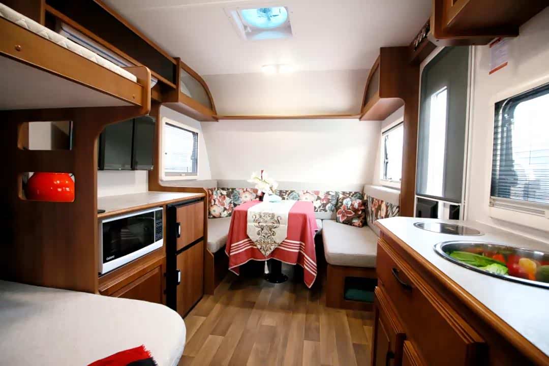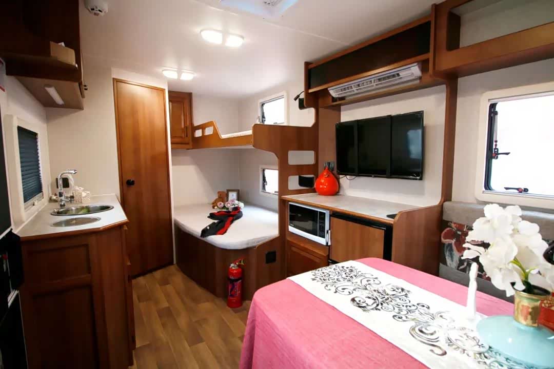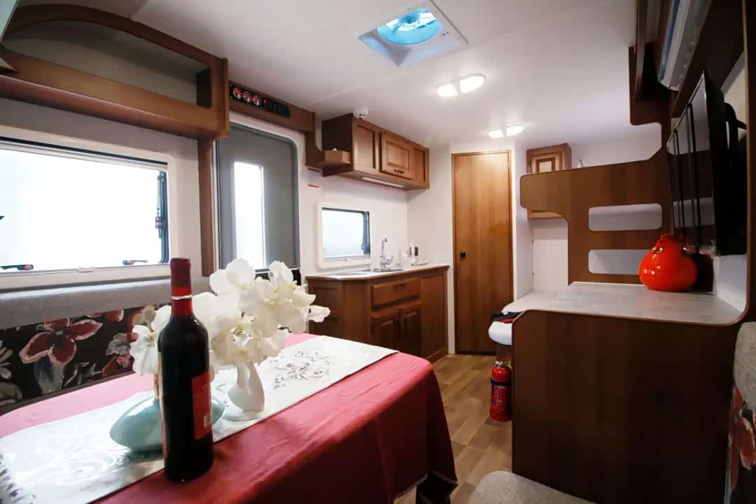 车辆最前方为会客区,U型环绕沙发设立此处,弥补弧线型前端带来的内高不足问题。沙发左右两侧开有两扇大面积的外推窗,并配备有防蚊纱网和遮光帘。沙发中间是一张升降桌,面积不小,平时几个人坐在一起聊天喝茶打牌,很是方便。当降下升降桌后,此处整体可拼出一张双人床铺供临时使用。