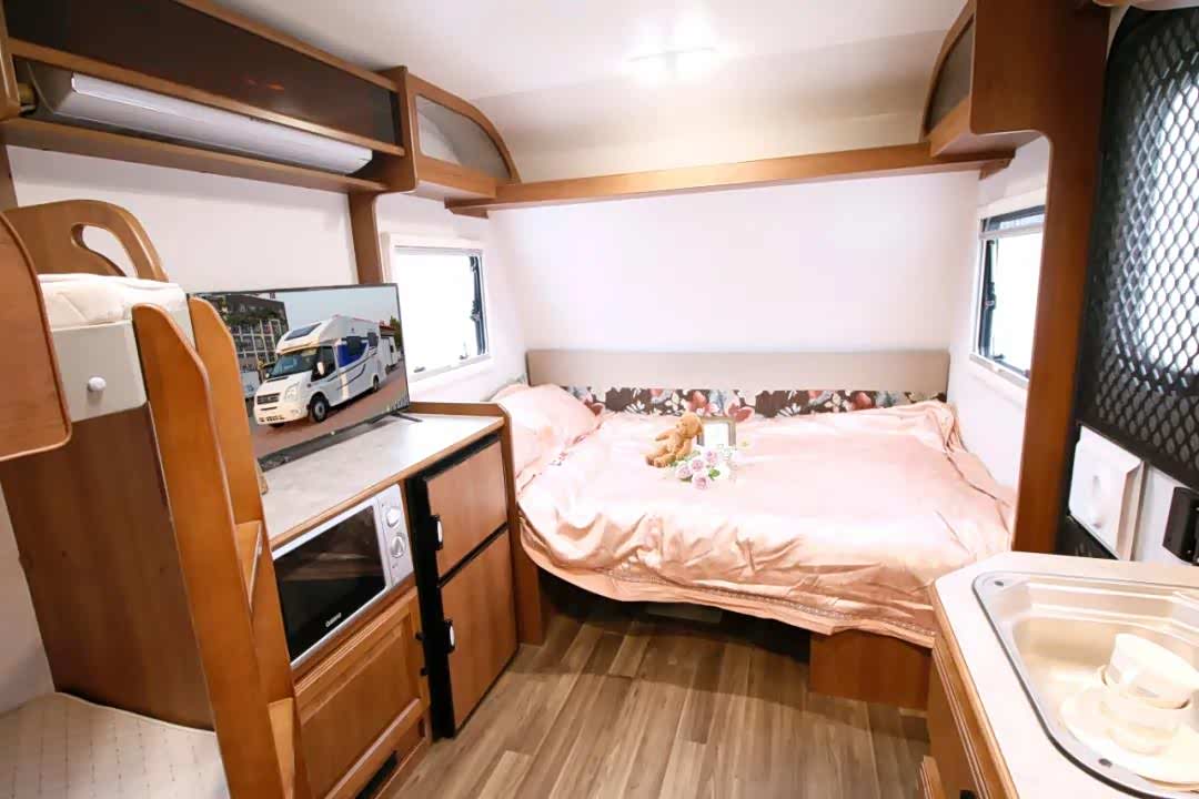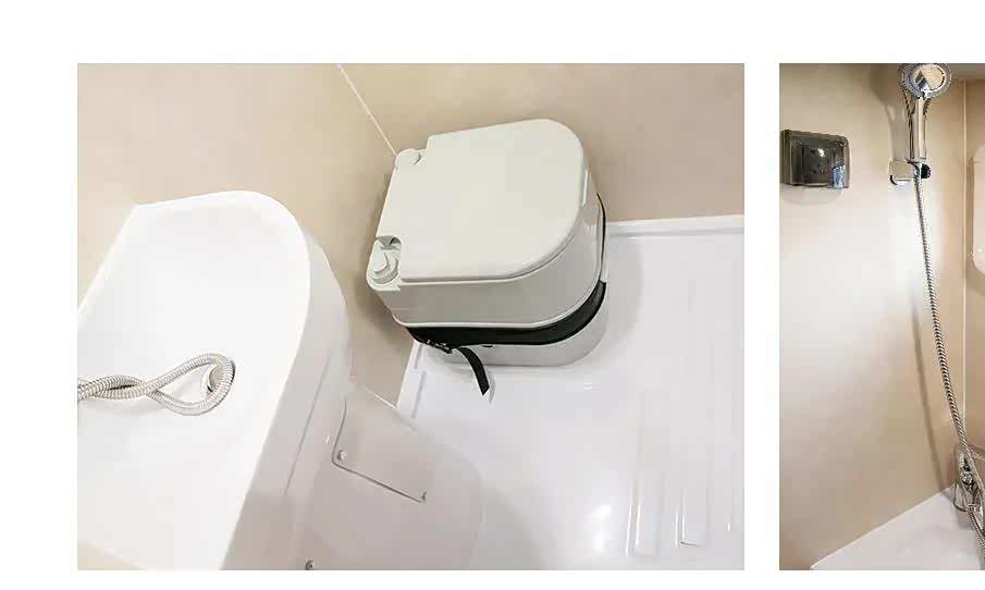 车尾左右两部分,一侧上下铺子母床,上铺较窄,下铺则有2000*1500mm的尺寸。另一侧的卫生间区域,标配有便携式移动马桶、一体式的淋浴喷头、洗手池、毛巾架等设施,足以满足日常生活需求。