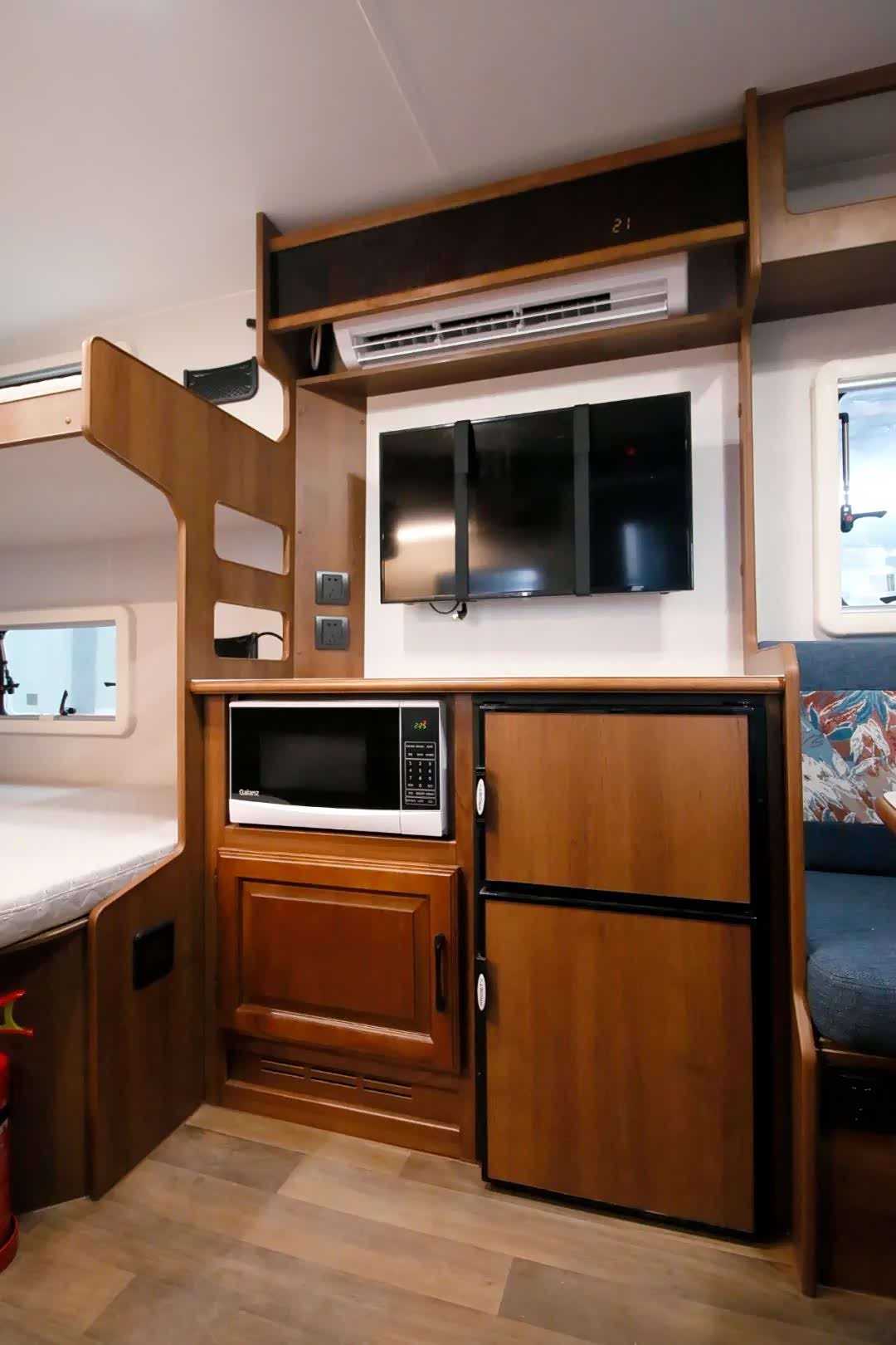 车辆中部,正对车门的是一个多功能的娱乐区。顶部内嵌有一台格力家用空调,靠下则有一台大尺寸小米智能电视挂在墙面上,而下方的柜台则可作为车内厨房的一个补充区域,配置有微波炉和房车专用冰箱。