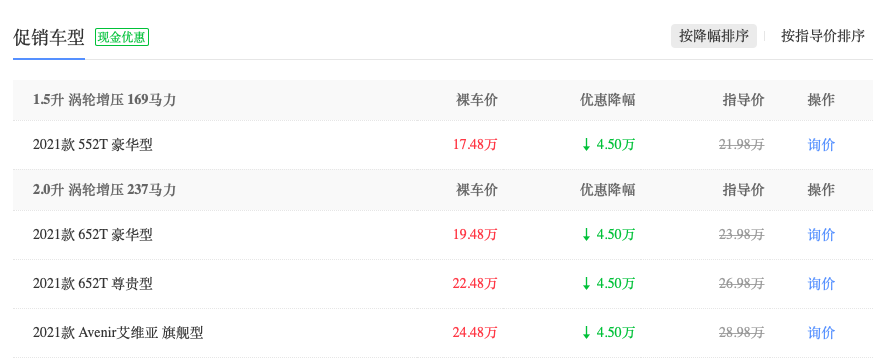 2021款别克君越搭载了两款发动机,分别是1.5T/2.0T,传动系统匹配的是9挡手自一体变速箱,最大输出功率分别是169马力和237马力,最高车速为235km/h,百公里油耗分别是6.5--6.9L/100km。