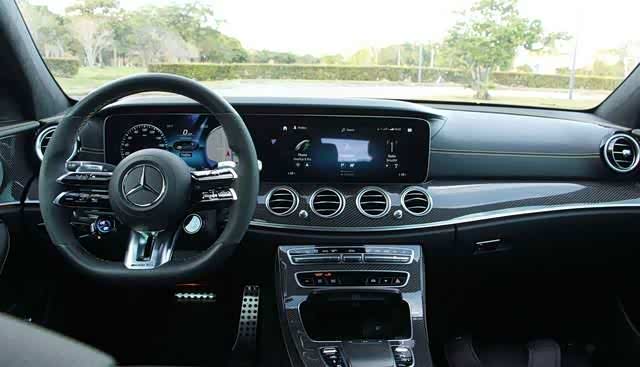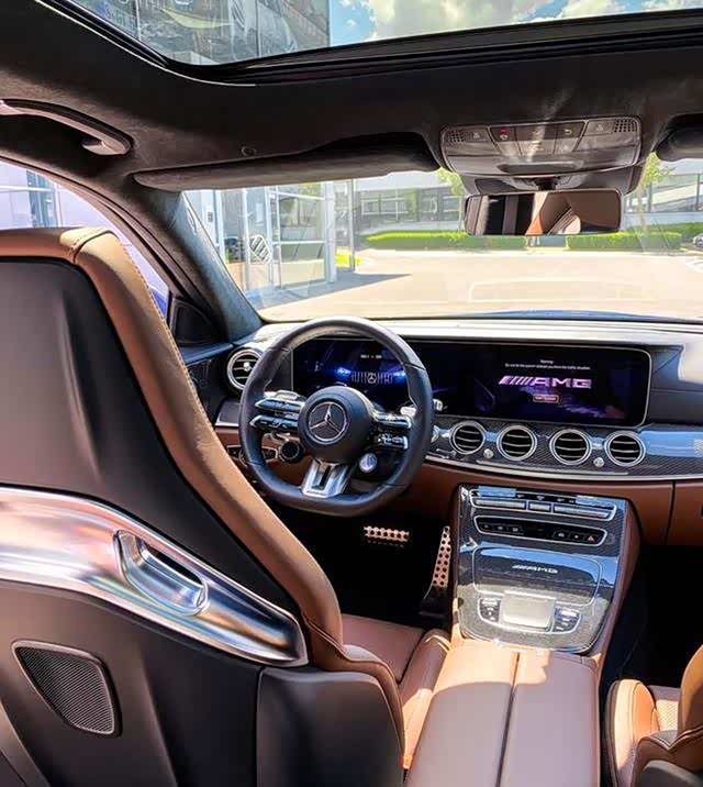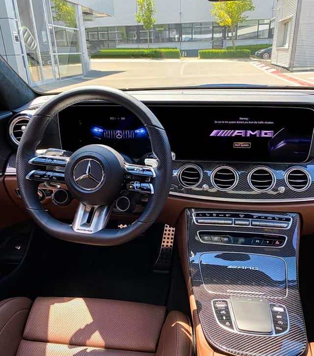 内饰还是E级的样式,大面积碳纤维、真皮、专属双缝线和Alcantara材质的加入,让车内充满战斗欲,完全没有了E级的悠然舒缓。此外,新款AMG E63 S旅行版还配备了一体式运动座椅,并在座椅、方向盘等位置增加了AMG的专属字母标志,同时双液晶屏可以显示不少关于驾驶和机件工作状态的“硬核“信息,符合其高性能应有的设定。