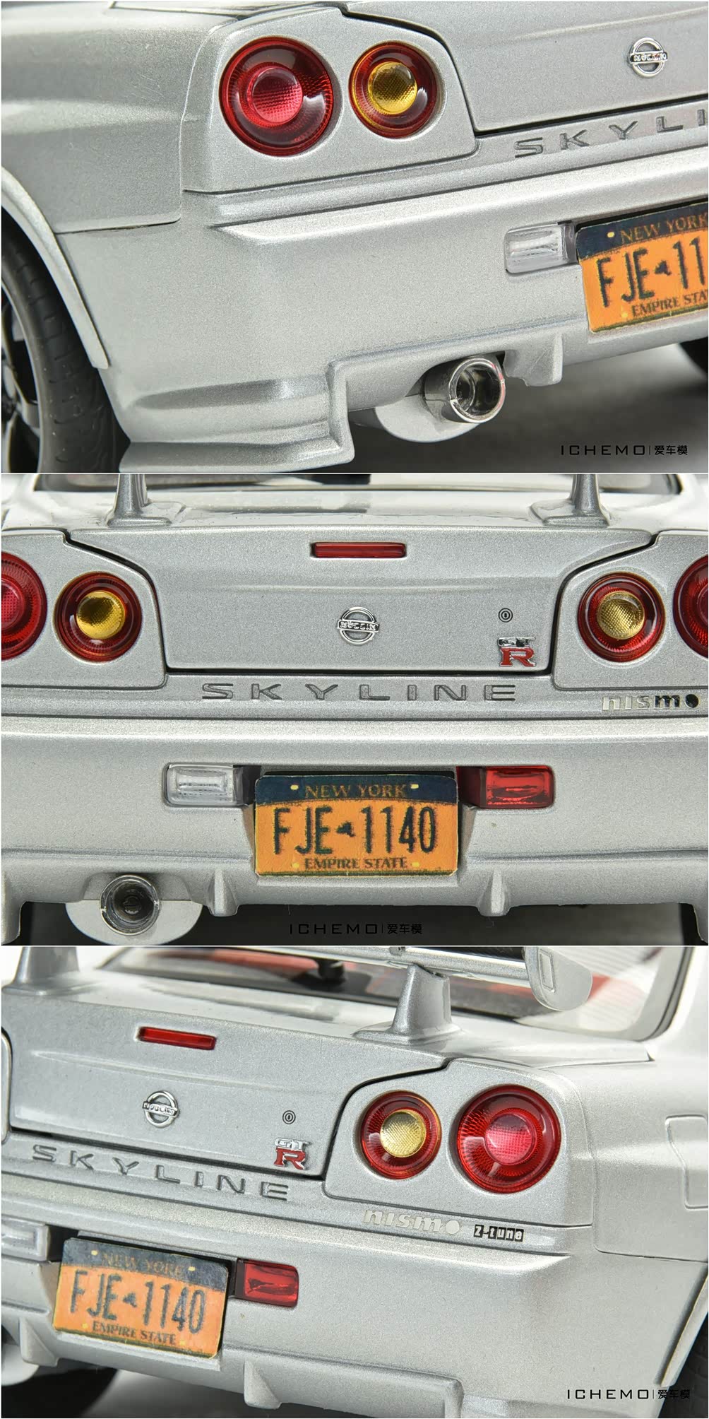 车尾细节参考实车还原,经典不过 R34 的屁股!值得一提的是,后备厢盖上的日产车标贴歪了,印象里很多同好都遇到了这样的情况。