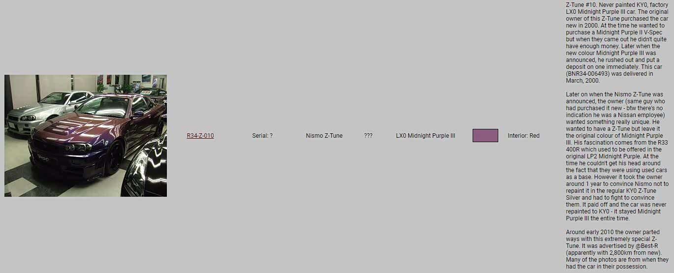换句话说,除了 Z-Tune Silver 和 Midnight Purple III,其他配色的 Z-Tune 模型均属 AUTOart 二创。顺便一提,查阅资料发现,除了底盘号 R34-Z-010 原漆午夜紫,还有一台底盘号 R34-Z-015 为 NISMO Omori Factory 大森工厂于 2018 年改色午夜紫,现车主是澳大利亚 V-Spec Performance - 有趣的是,GTR-Registry 上显示 “该车正在恢复原色”。