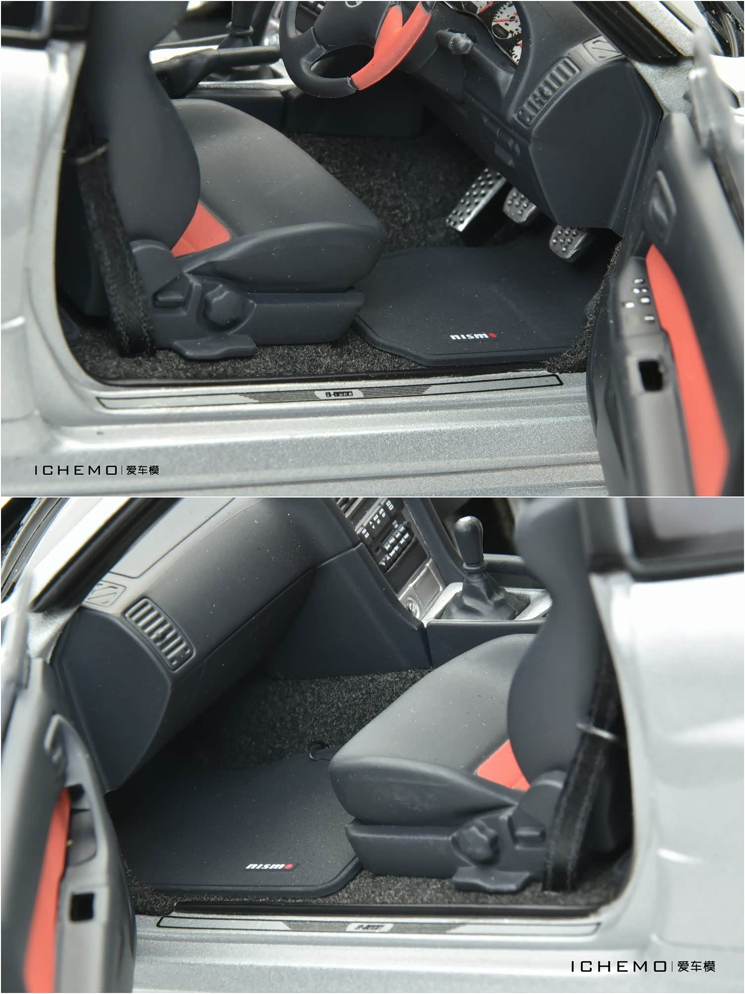 内室地板有植绒,前/后排均有 “脚垫” - 前排还有 nismo 彩印字符;安全带为织物材质。