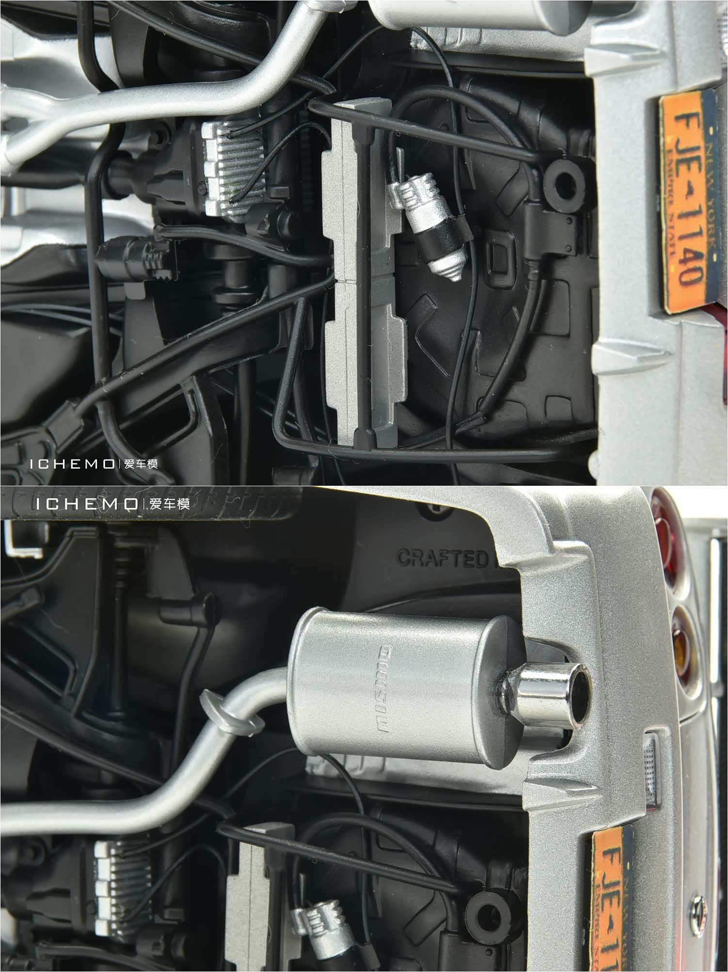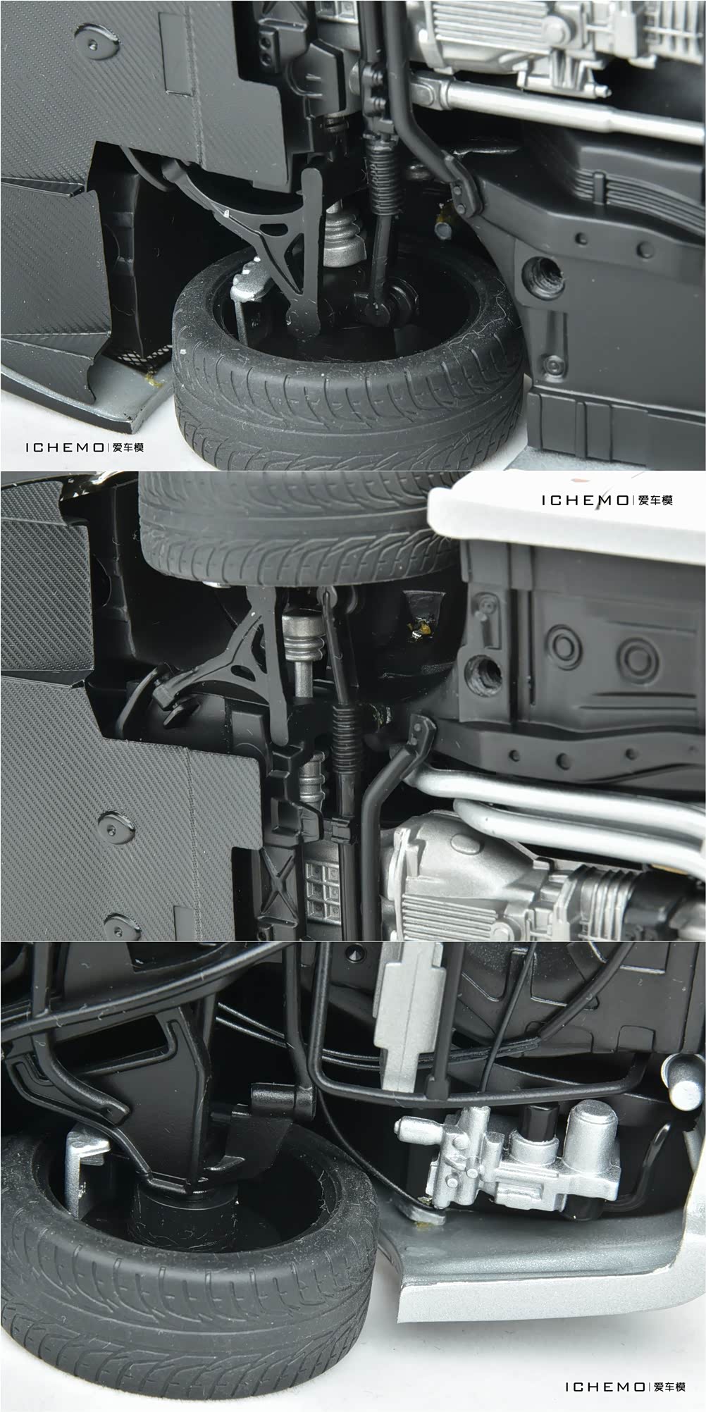 大底为塑料材质,可见传动轴、排气、变速箱、油冷、悬挂等等细节;从底盘位可看到比较完整的油底壳,油冷处丰富的管线亦是 “第一版复刻” 细节水平提升的体现。