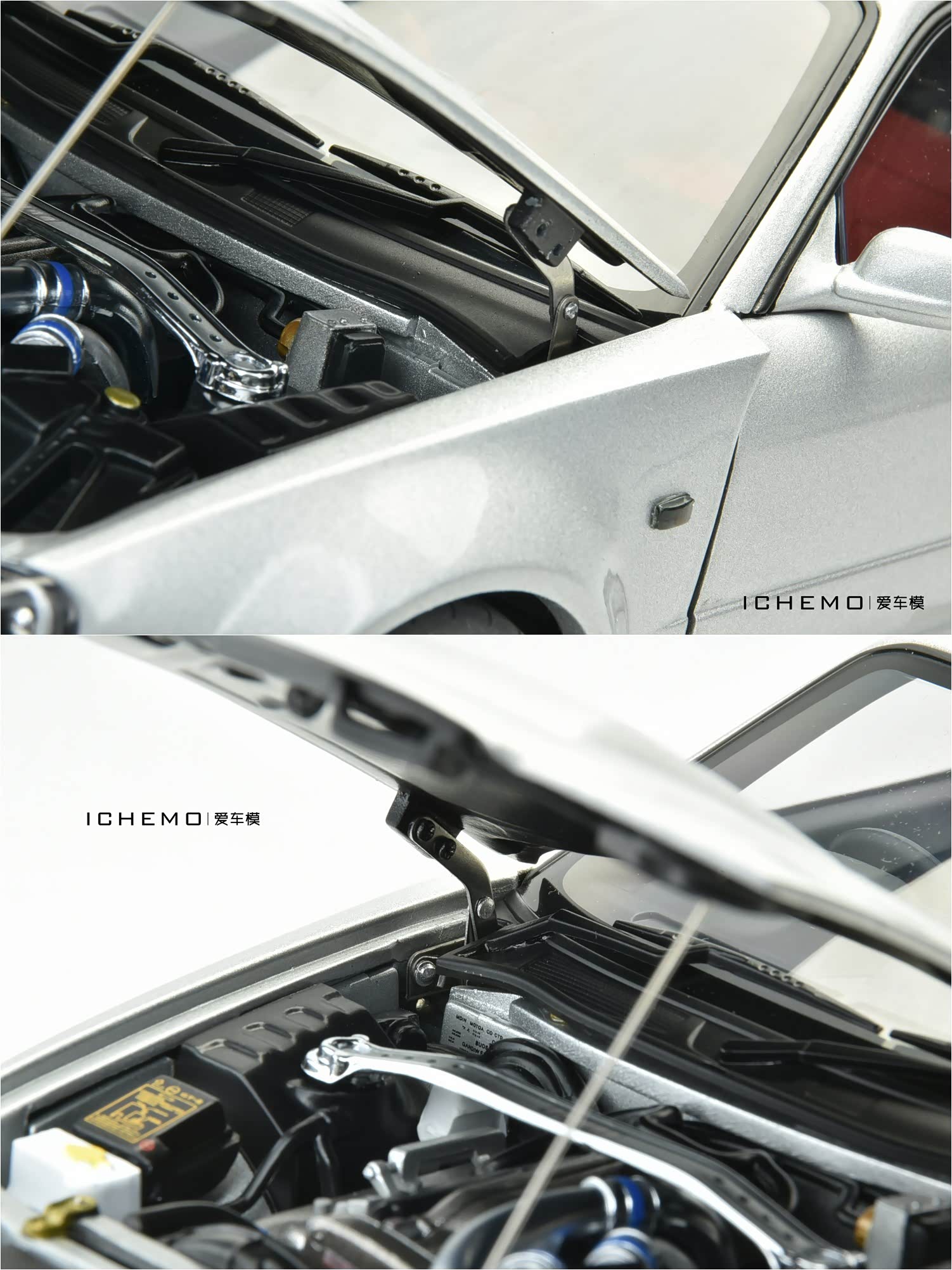 发动机盖连接合金铰链是 “第一版复刻” 工艺细节水平提升的体现之一,据说通过调整铰链可以微调引擎盖位置以找齐缝隙;引擎盖负面为黑色,有镂空和管路等细节刻画。