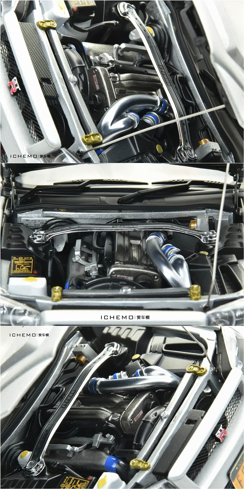 AUTOart 还原了比较完整的 RB26DETT Z2(Z-tune concept engine spec.2)发动机模型;机舱内细节丰富,分色体现质感,各处铭牌亦有表达,只是部分字符比较模糊,信息不明;水箱、风扇等部零件独立。