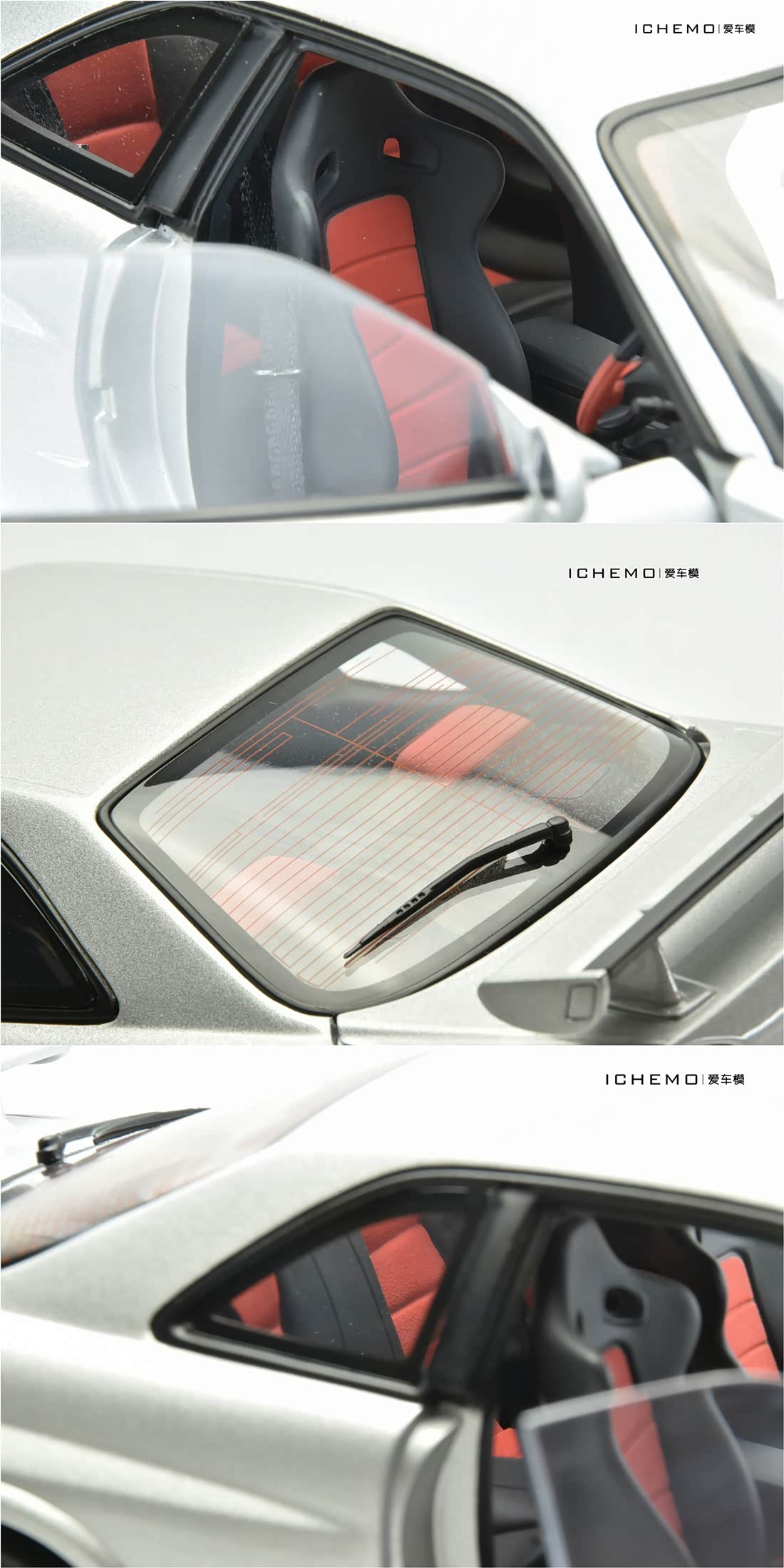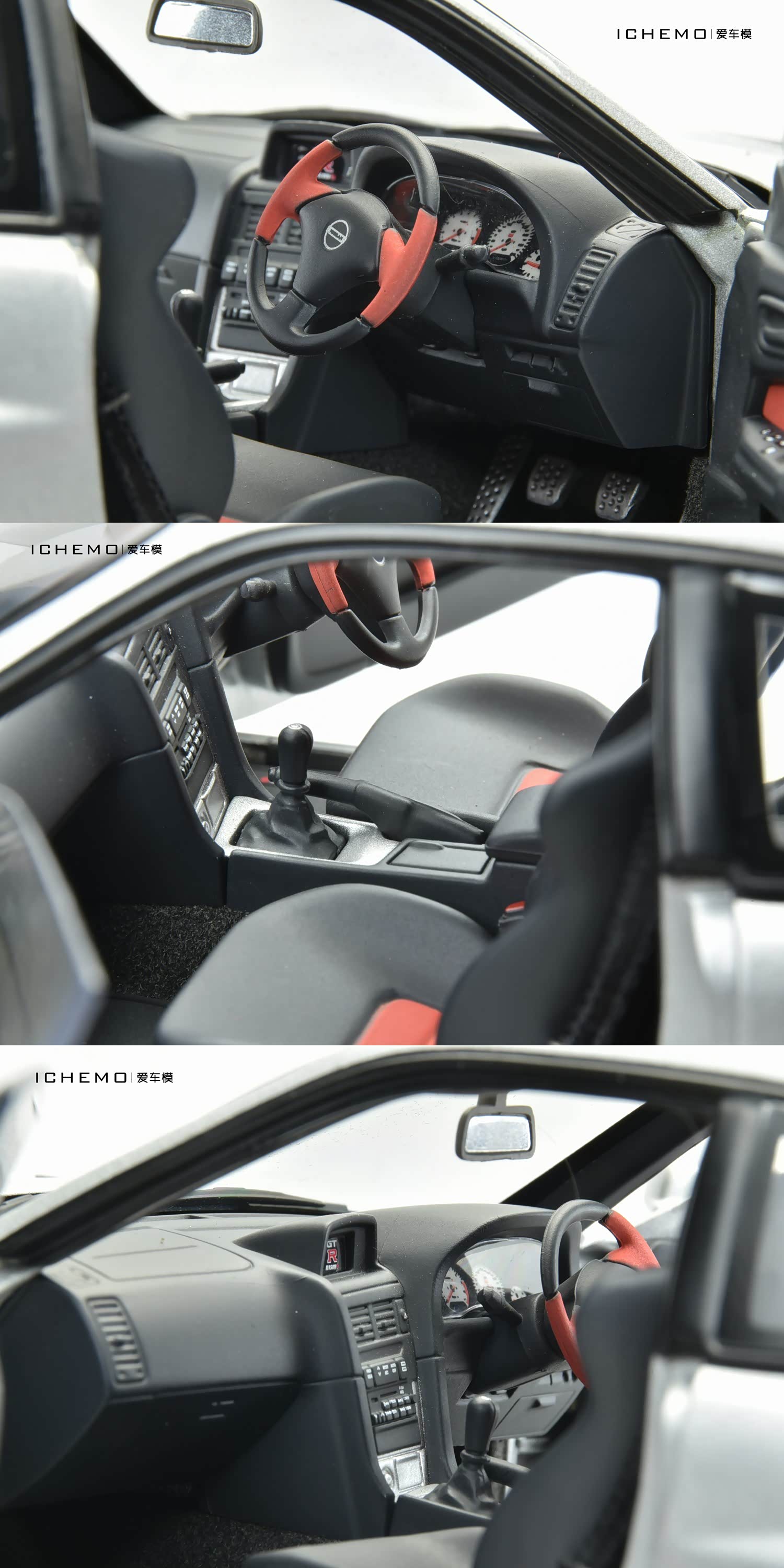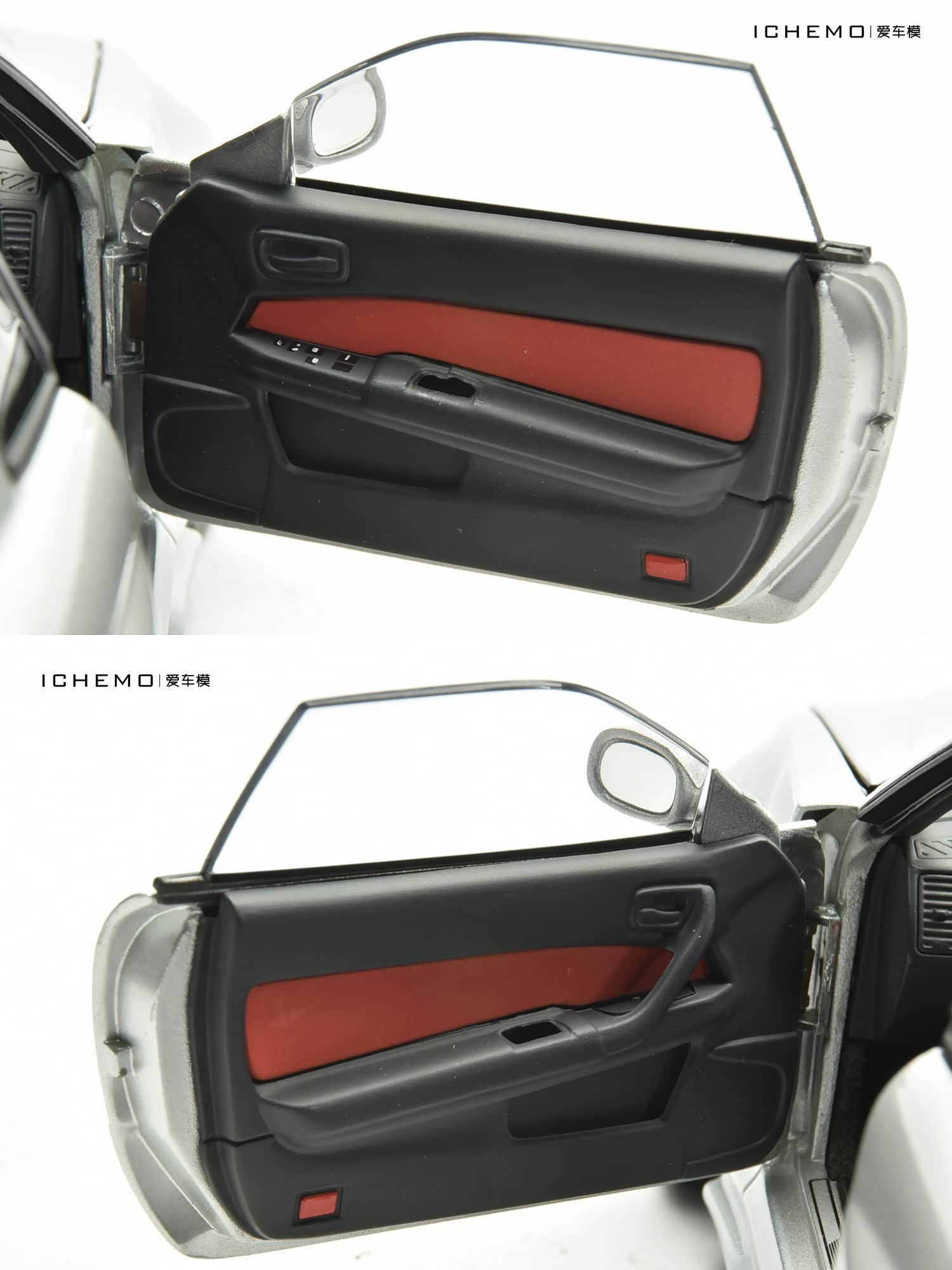车门内衬板为黑/红拼色,与内室主色调一致;可见电动车窗按钮等细节分色。值得一提的是,此车驾驶侧车门内把手处损坏,猜测应为 AUTOart 祖传挂钩所致。