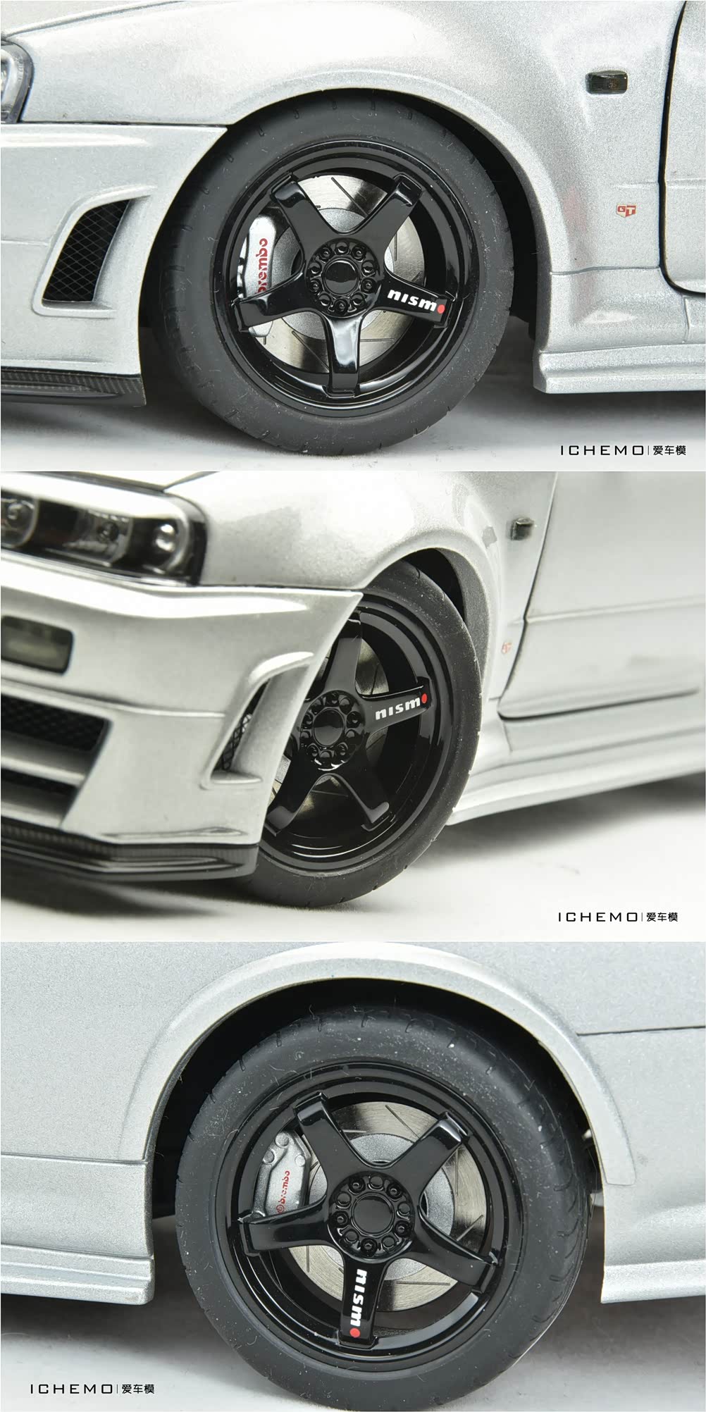 轮毂为 LM GT4 GT500 Model 式样(黑色方案),这也是 Z-Tune 的专属配置;轮胎为普利司通 POTENZA RE01R(265/35-18),但 AUTOart 没能还原相关的标识;刹车方面,Brembo 前6/后4 活塞卡钳有刻画,刹车盘为合金贴片。