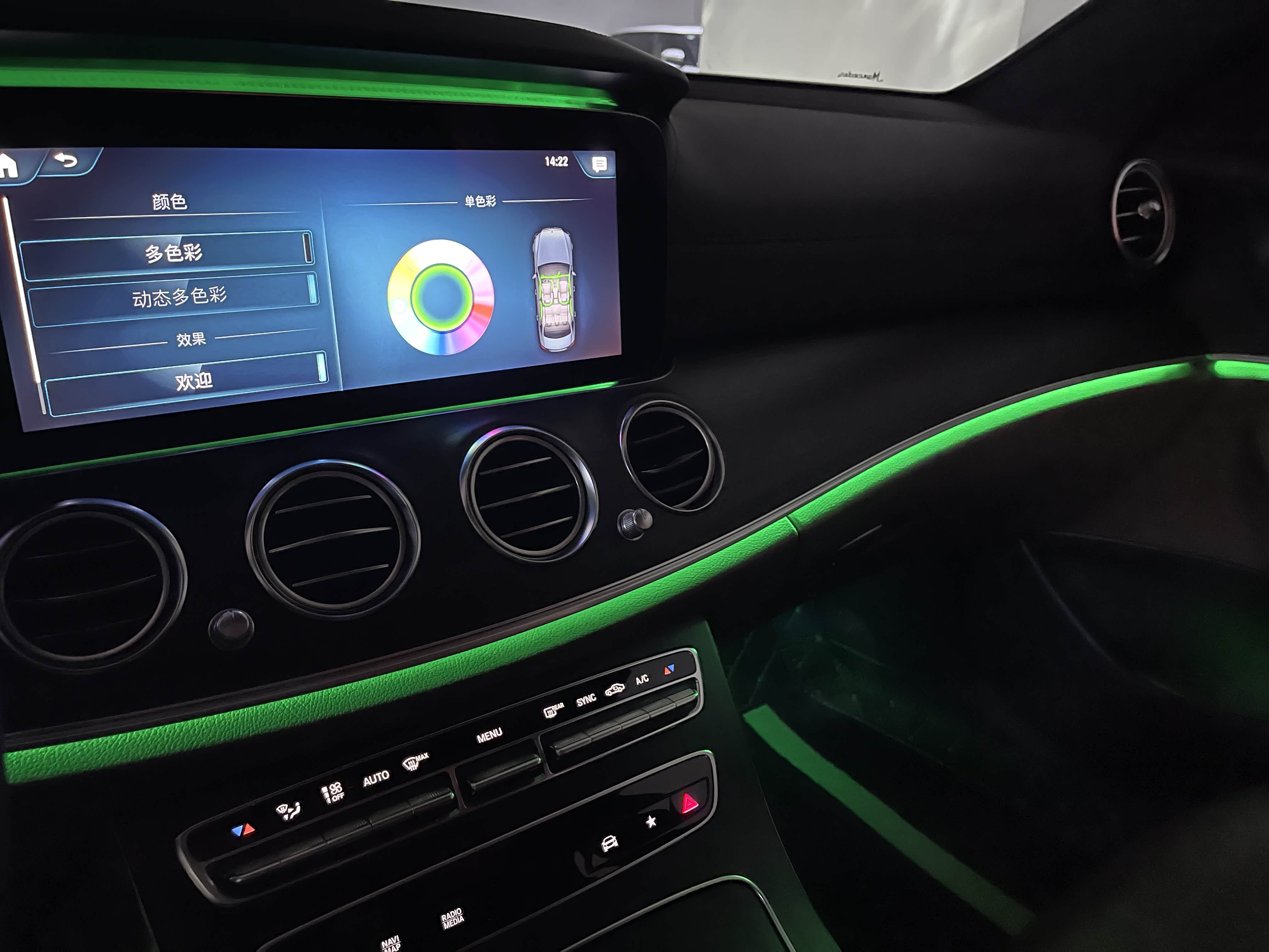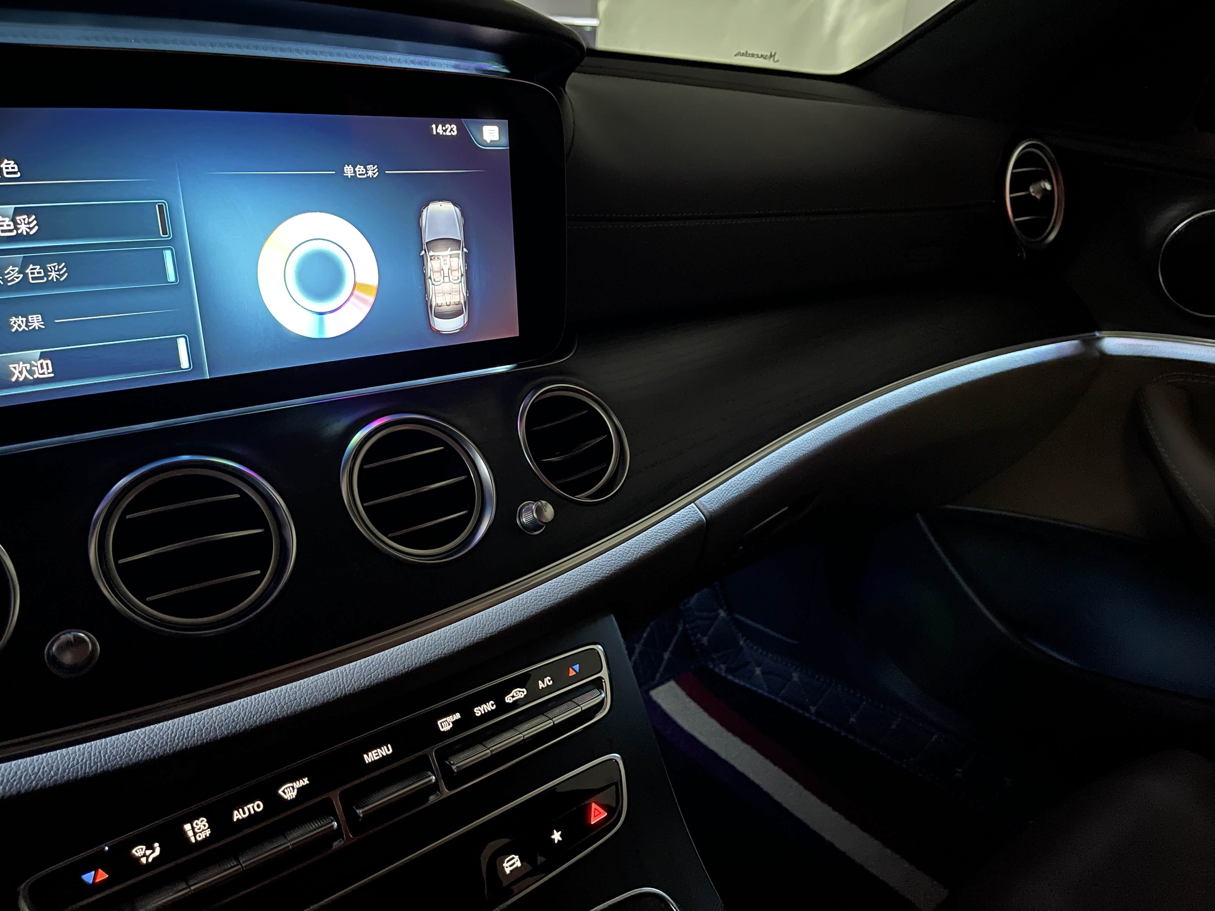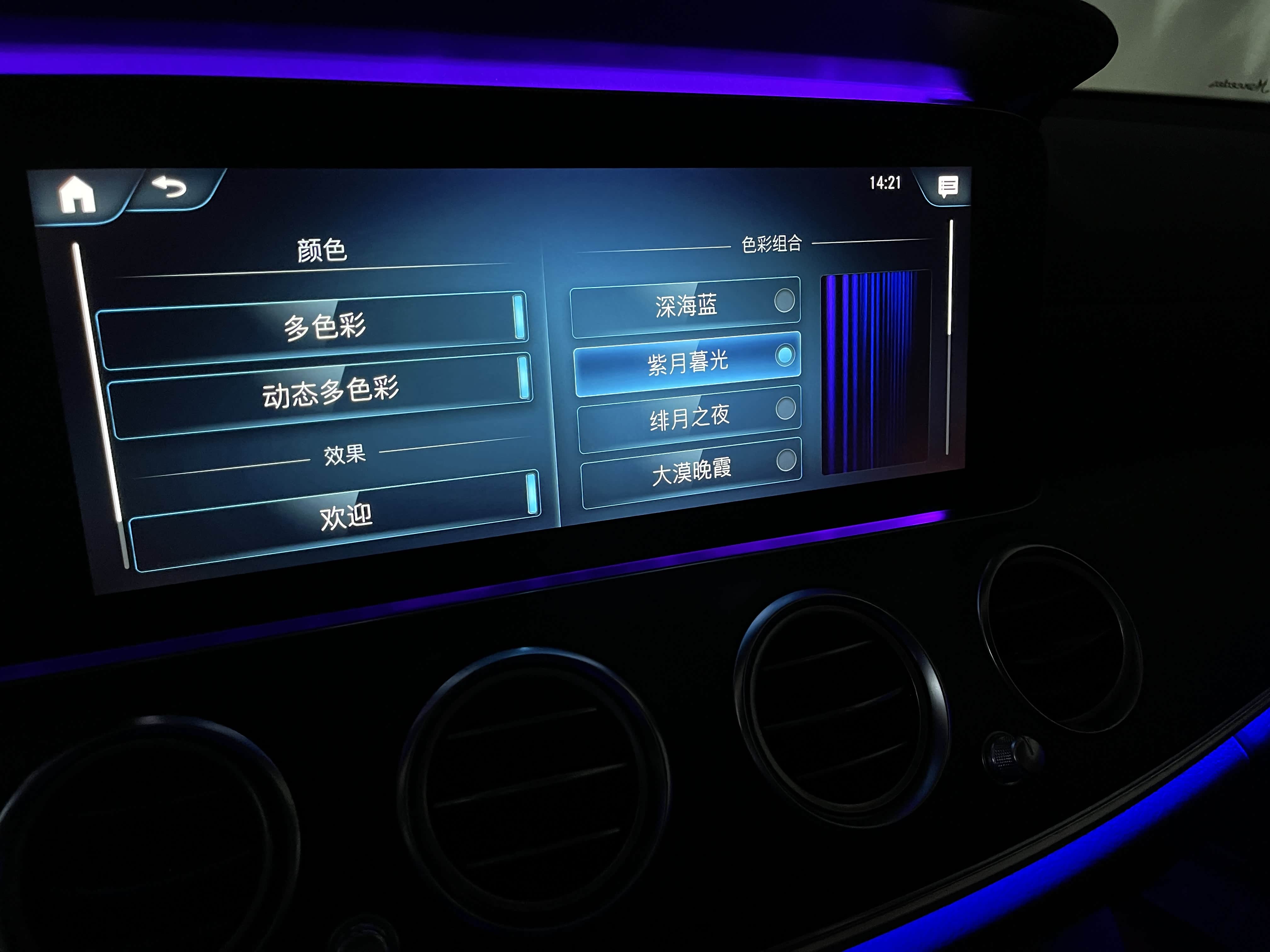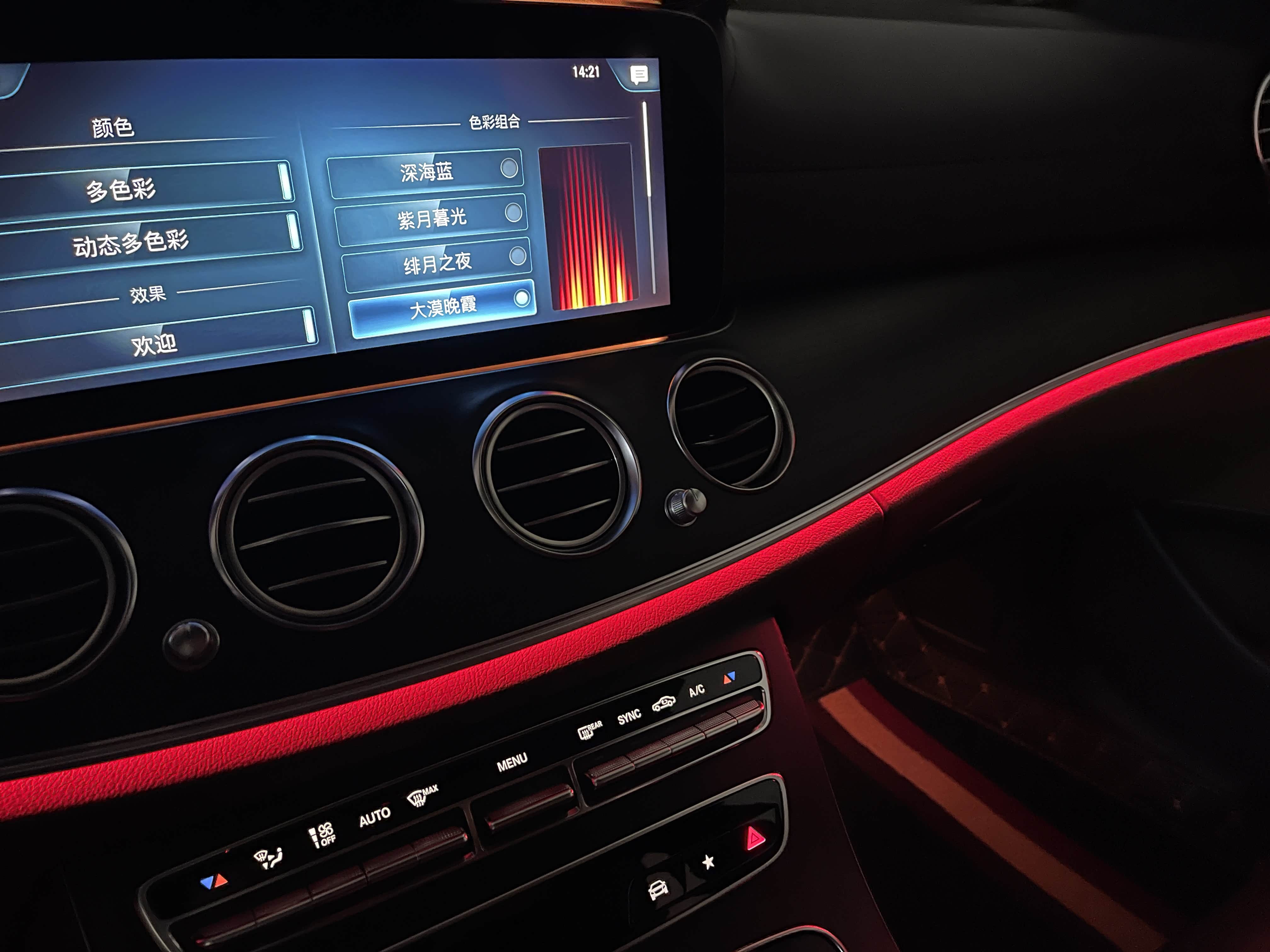 氛围灯是新E级最让人感到迷幻的部分,其自带的主题有深海蓝、紫月暮光、绯月之夜和大漠晚霞。其中深海蓝是默认颜色,也是很多人一直在使用的主题色,不得不说这个内饰氛围灯颜色和E级搭配得确实不错,集科技感和奢华感于一体,夜间视觉感觉非常舒服。