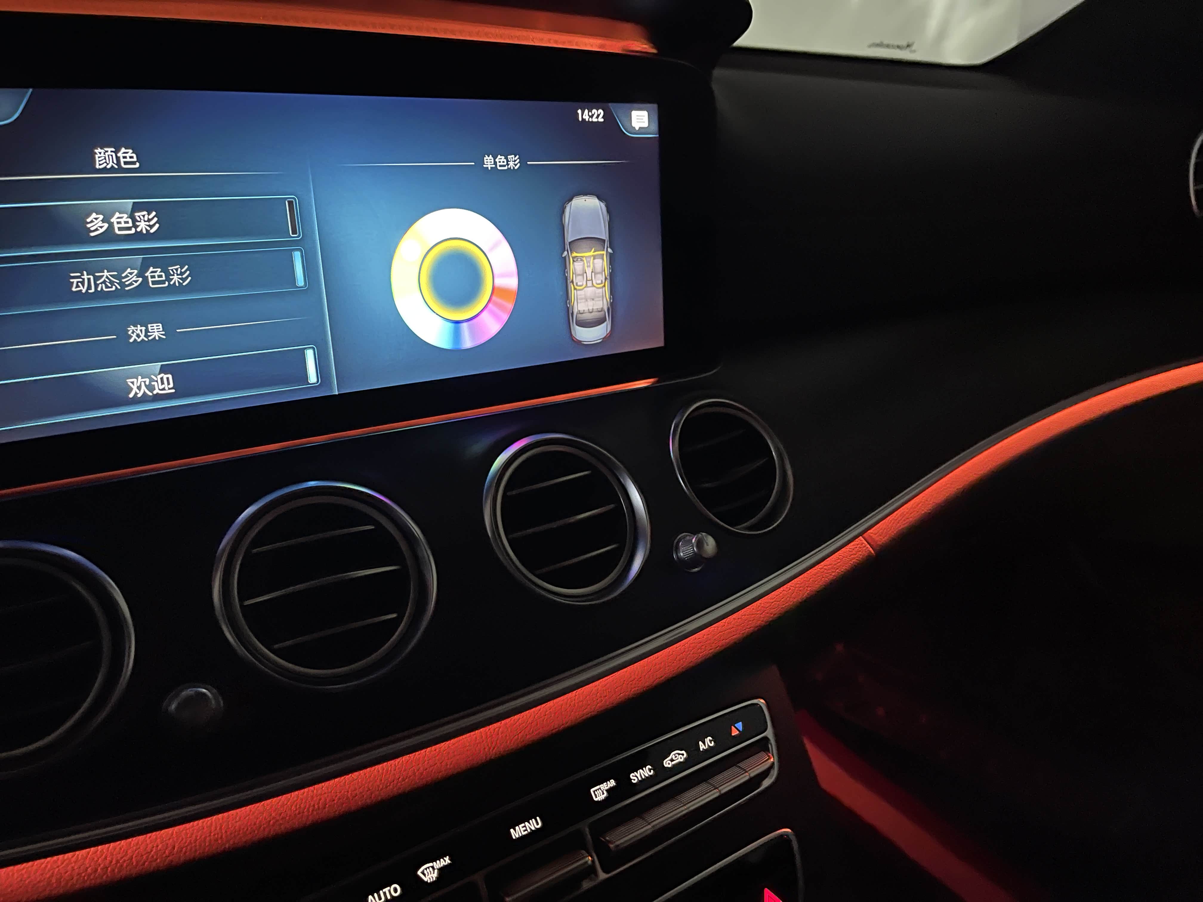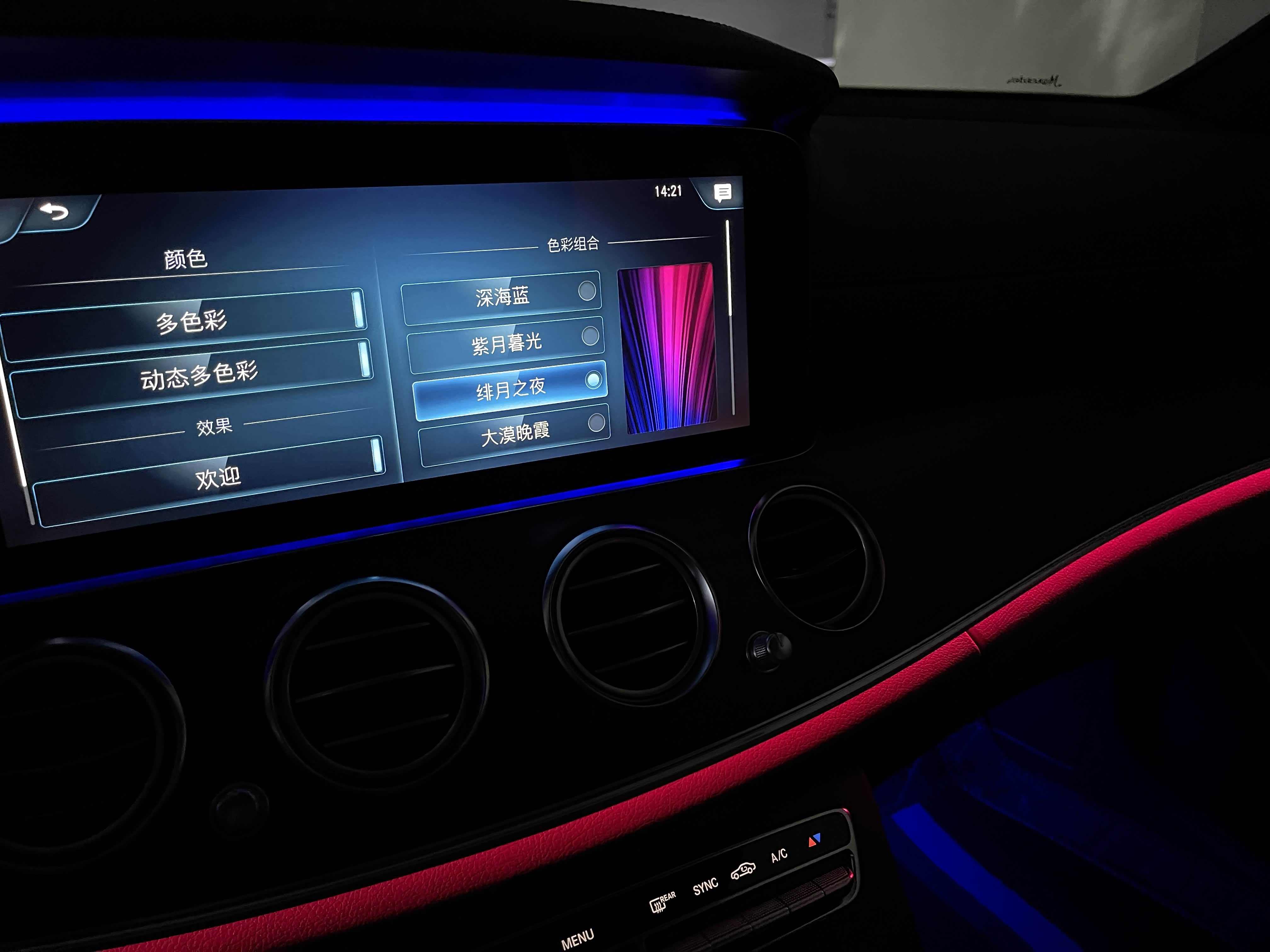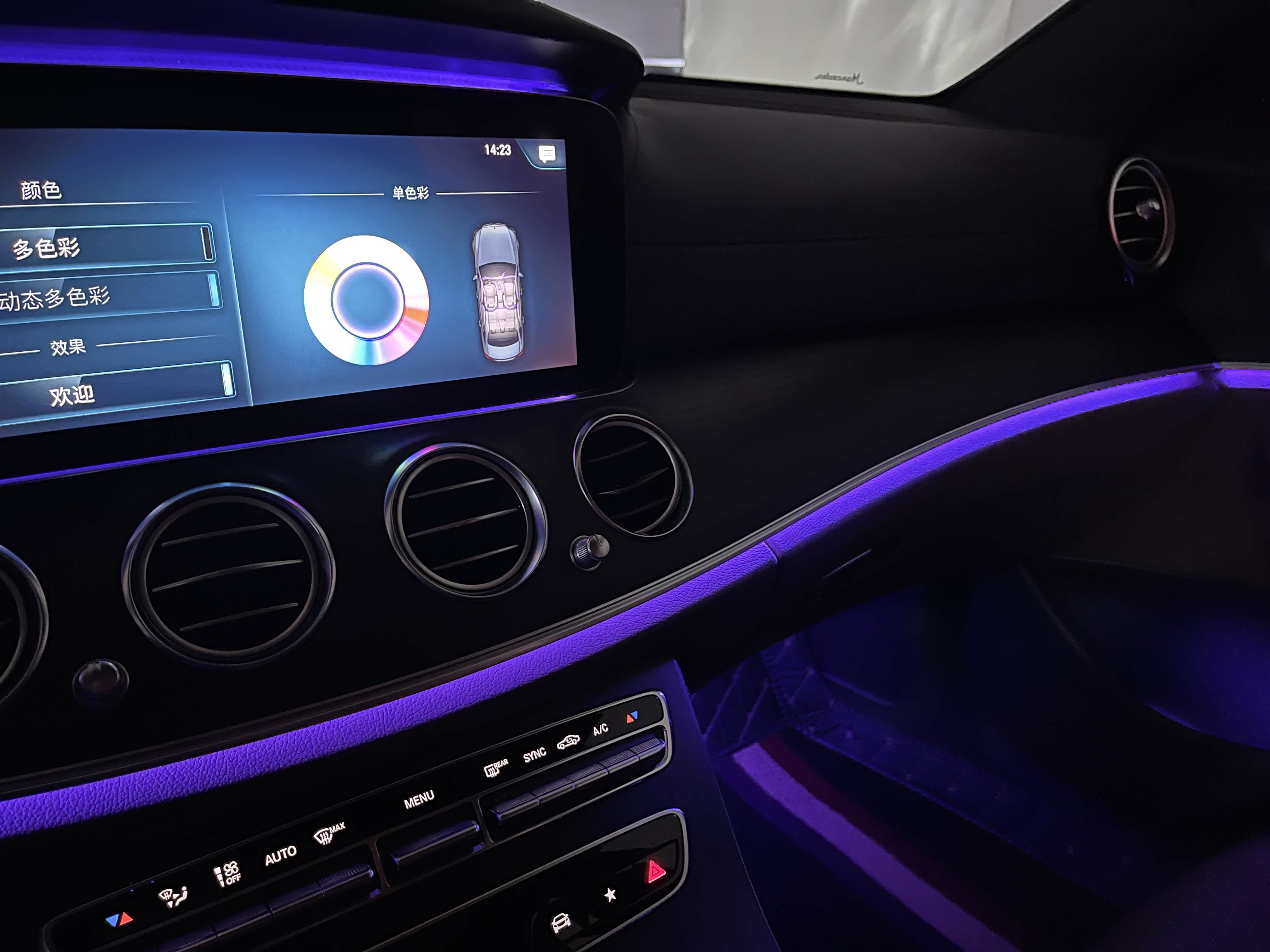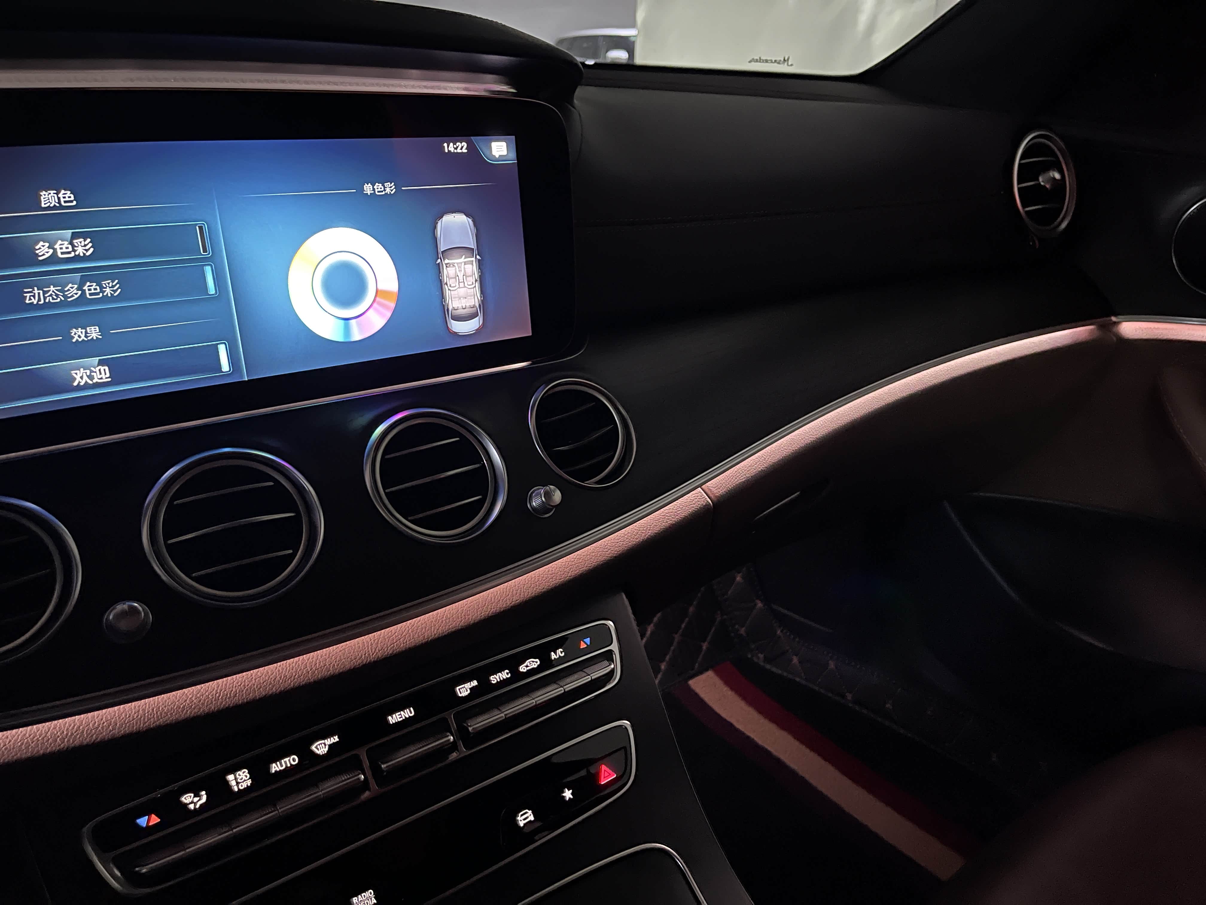 氛围灯是新E级最让人感到迷幻的部分,其自带的主题有深海蓝、紫月暮光、绯月之夜和大漠晚霞。其中深海蓝是默认颜色,也是很多人一直在使用的主题色,不得不说这个内饰氛围灯颜色和E级搭配得确实不错,集科技感和奢华感于一体,夜间视觉感觉非常舒服。