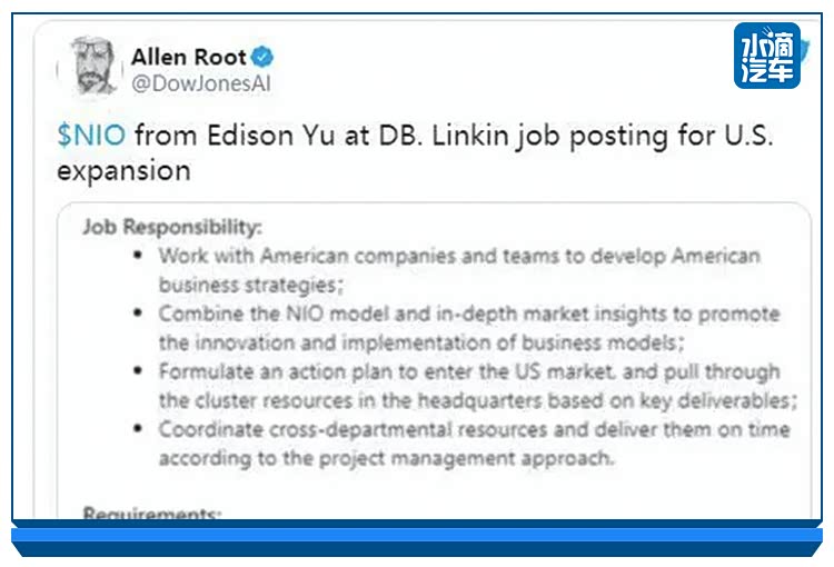 近日,据外媒报道,蔚来将考虑进军美国市场。德意志银行(Deutsche Bank)的分析师Edison Yu发现一个关于蔚来或许将要进军美国市场的行为,其在领英LinkedIn看到一份有关蔚来的美国市场商业规划的工作招聘。虽然目前职位现已被关闭,但Edison Yu表示,蔚来或将正在寻找一个“能制定进入美国市场行动计划”的人。