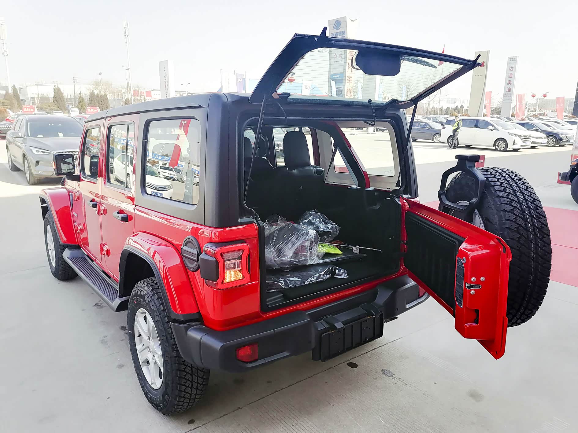 牧马人打开后备箱的方式独一无二,上面的向上打开玻璃,下面的采用的是侧拉门,连着备胎一起拉出来