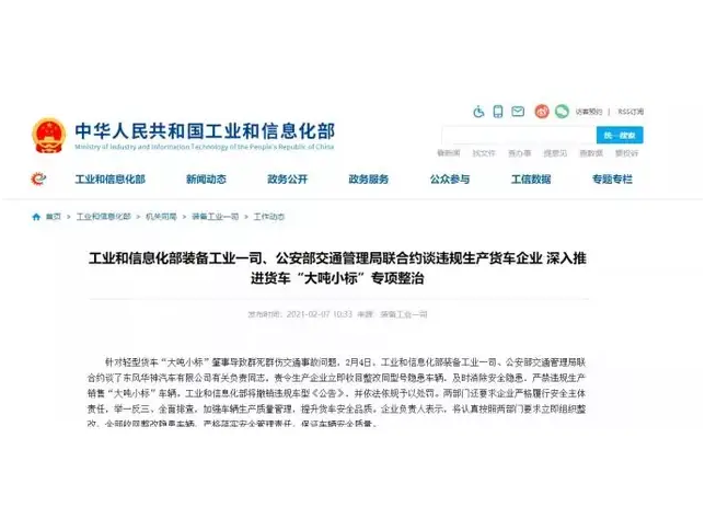 2月4日,针对轻型货车“大吨小标”肇事导致群死群伤交通事故问题,工业和信息化部装备工业一司、公安部交通管理局(下称“两部门”)联合约谈了东风华神汽车有限公司有关负责人,责令生产企业立即收回整改同型号隐患车辆,及时消除安全隐患,严禁违规生产销售“大吨小标”车辆。