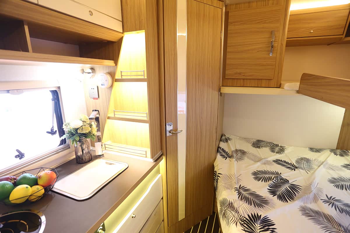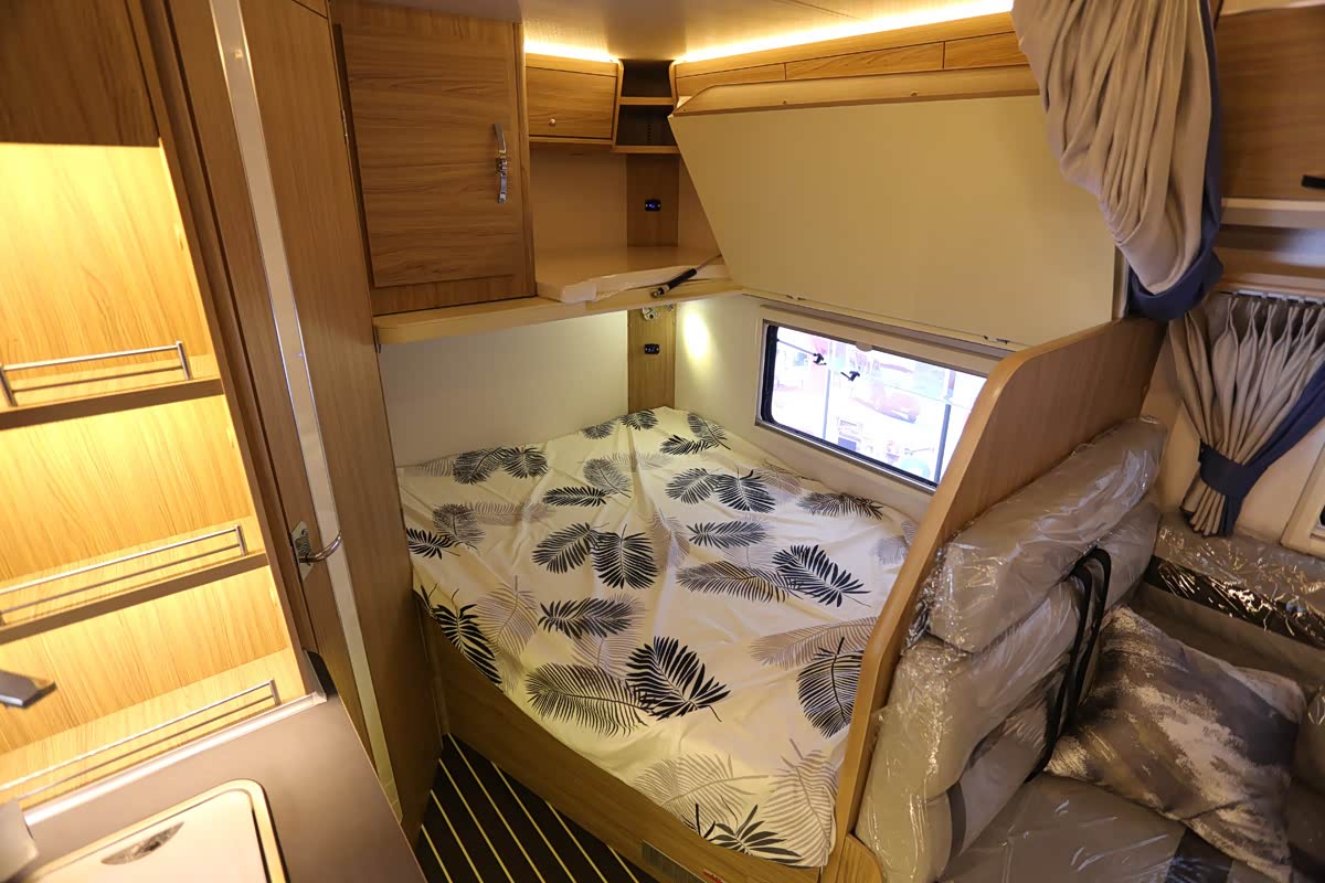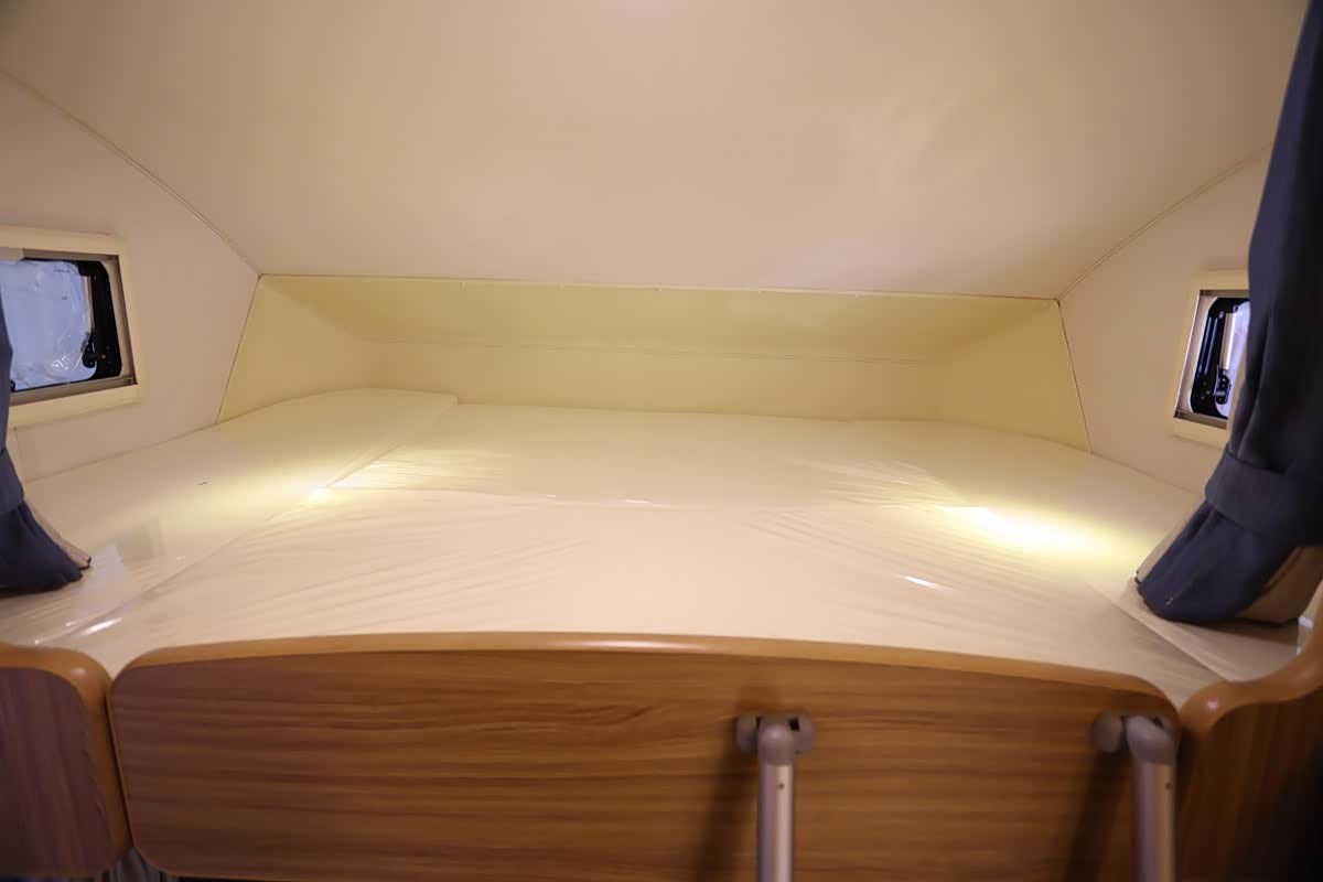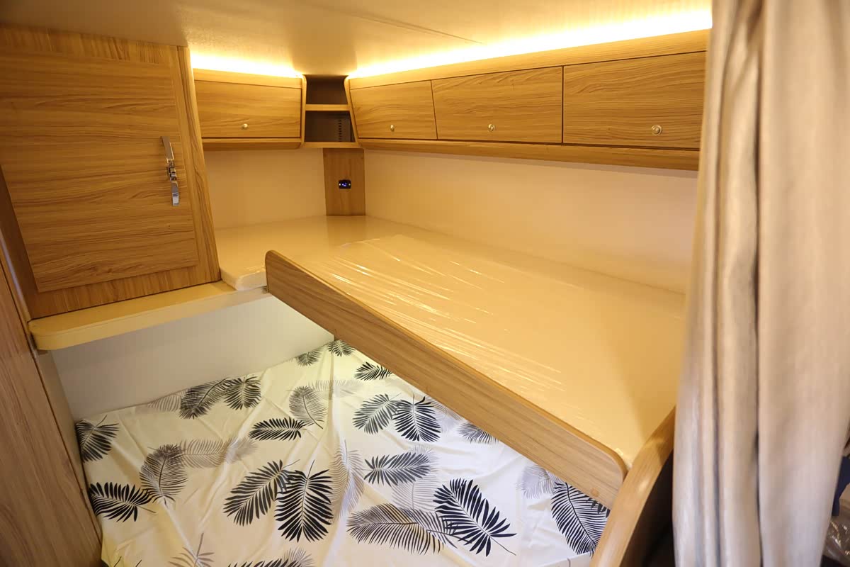 车尾卧室采用了双层床铺的设计,下铺为双人床,尺寸达到1.85×1.40(米),上铺可上翻结构的设计,在不使用上铺的时候不会影响下铺垂直空间。