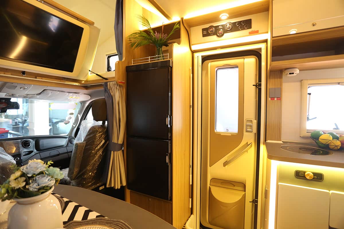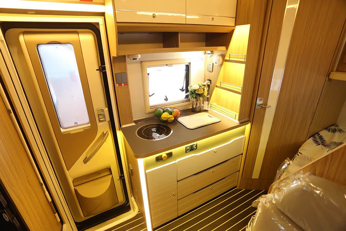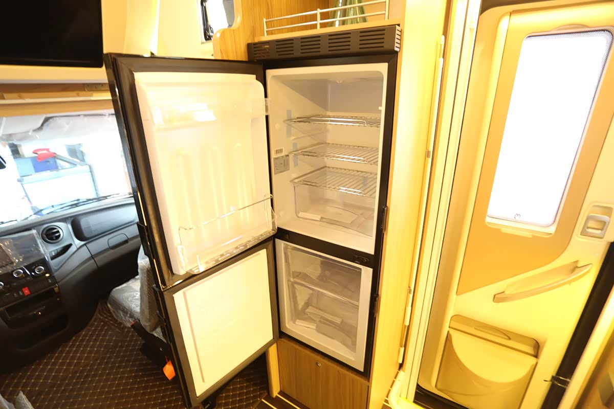 客厅对面为厨房区,靠近驾驶室一侧布置有车载冰箱,标配的是一款弗罗斯特房车专用冰箱,容积达到148升,带有独立冷冻区。
