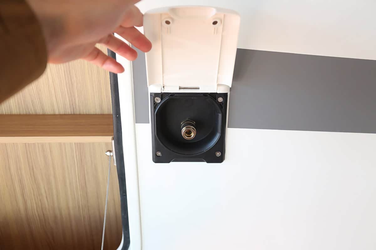 车外预设了取水口,可以使用快接花洒在车外用水。例如我们在海滩玩耍后,上车前可以在车外清洗身上的沙子;对于带宠物狗一起旅行的朋友,也可以在车外给宠物洗澡。