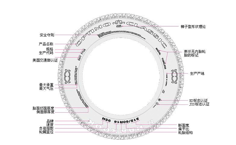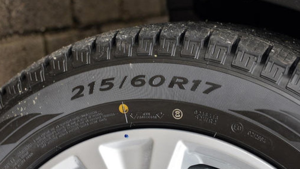 而后就应该是其尺寸标识,如215/60R17,这一串简单的数字可以体现四个信息。第一215代表的是轮胎的宽度为215mm,轮胎越宽则舒适程度和制动效果越好,但同时也因为与地面接触面积增大,而导致其油耗和价格的增高。