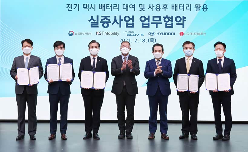当天,韩国工业部长Sung Yun-mo与现代汽车集团、现代Glovis、LG能源解决方案和KST Mobility就电动车电池租赁项目签署合作协议。今年,韩国将开始针对电动出租车和电动卡车的测试服务,从下月起,20辆现代Kona EV将用于测试服务;明年,服务对象将扩展至氢能源公交。