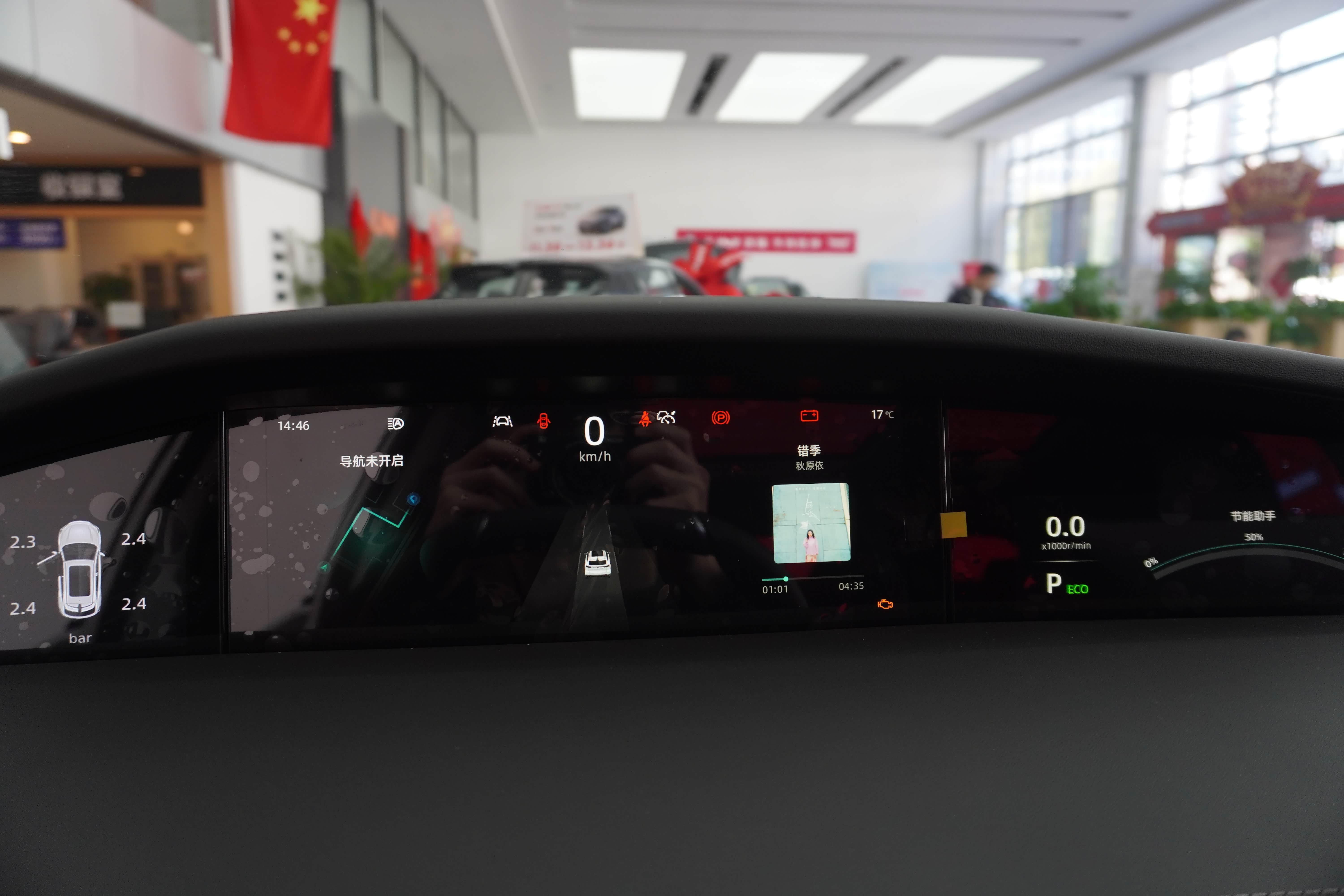 它不是一个整体屏是相加在一块的,这里要说的一点缺点就是,衔接处的缝稍微有那么一点大,但是信息挺丰富的,像最左侧的,是一个主动式的,像中间那块主屏幕能显示音乐、导航,包括行驶的一些道路信息,最右侧的话就是一些油耗、转速的信息。