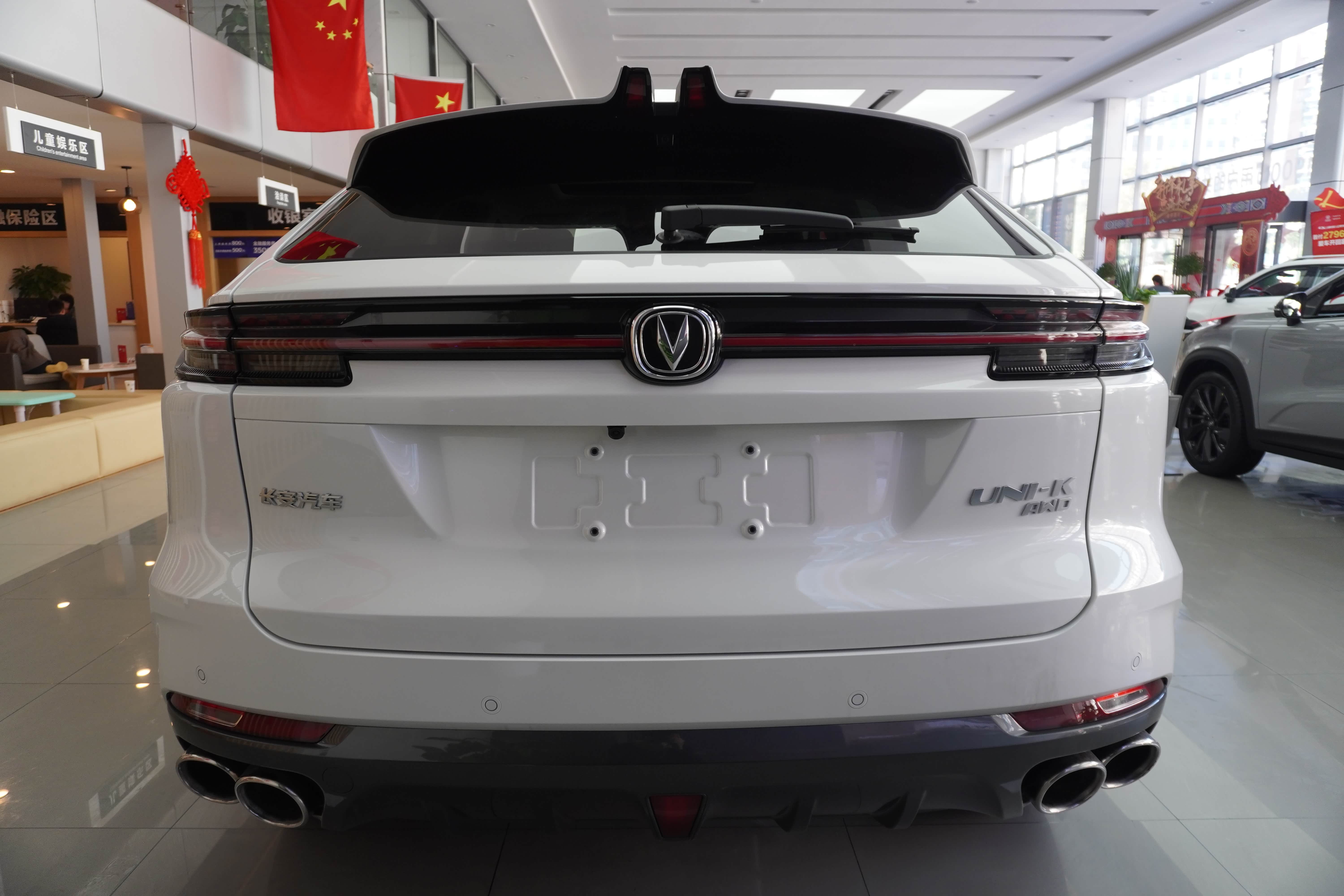 车尾方面的话,圆润的同时层次感也十足,1层,2层,3层,4层,贯穿式的尾灯,本身就点亮之后辨识度很高,它外部的灯罩的话是一个透明的,底色是黑色的,所以哪怕不点亮的情况下,我们看过去,有一个熏黑的效果,辨识度也是很高的,再往下的话双边共4处排气,排气孔有拳头大,这是真的也是非常的夸张,还有一点值得说的就是,内部的空间,就是后备箱的空间,这里目前来讲UNI-K的话,没有一个详细的参数,我们也不知道它是多少升,值得有一点肯定的就是,它采用了一个溜背式的处理,所以你如果不是很高的物体要放里面,它能放很长,如果说你一个等方四四方方的盒子基本上就是很难放下,它内部可能放得下,但外部的话一个溜背的处理,所以越往外它其实这个高度是越低的,这一点大家要注意一下,整个车尾的话就差不多这些了。