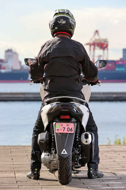 本田PCX e:HEV坐高784mm,图中骑士身高176cm,体重62kg,驾驭这辆车相当的轻松,双脚掌着地无压力。